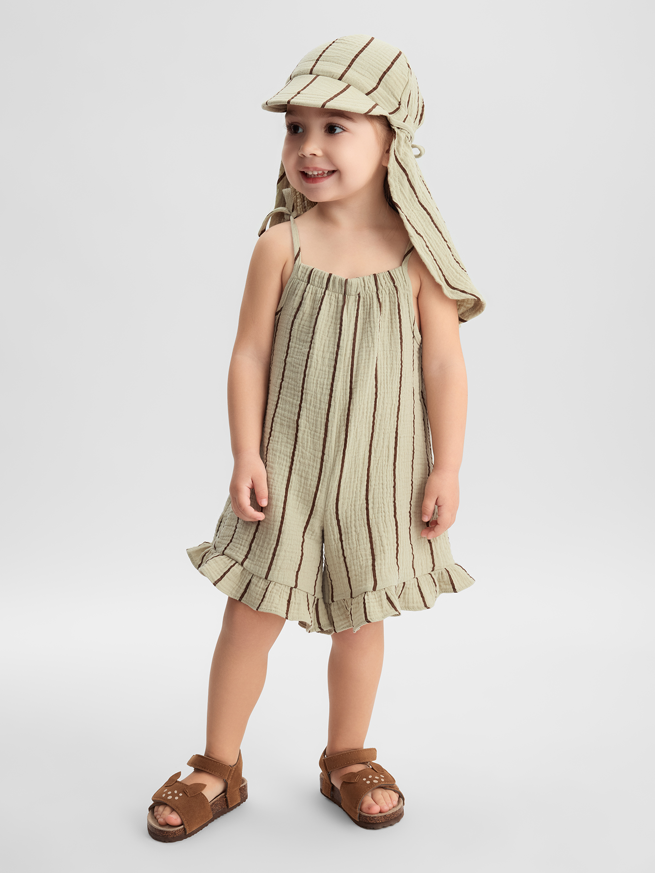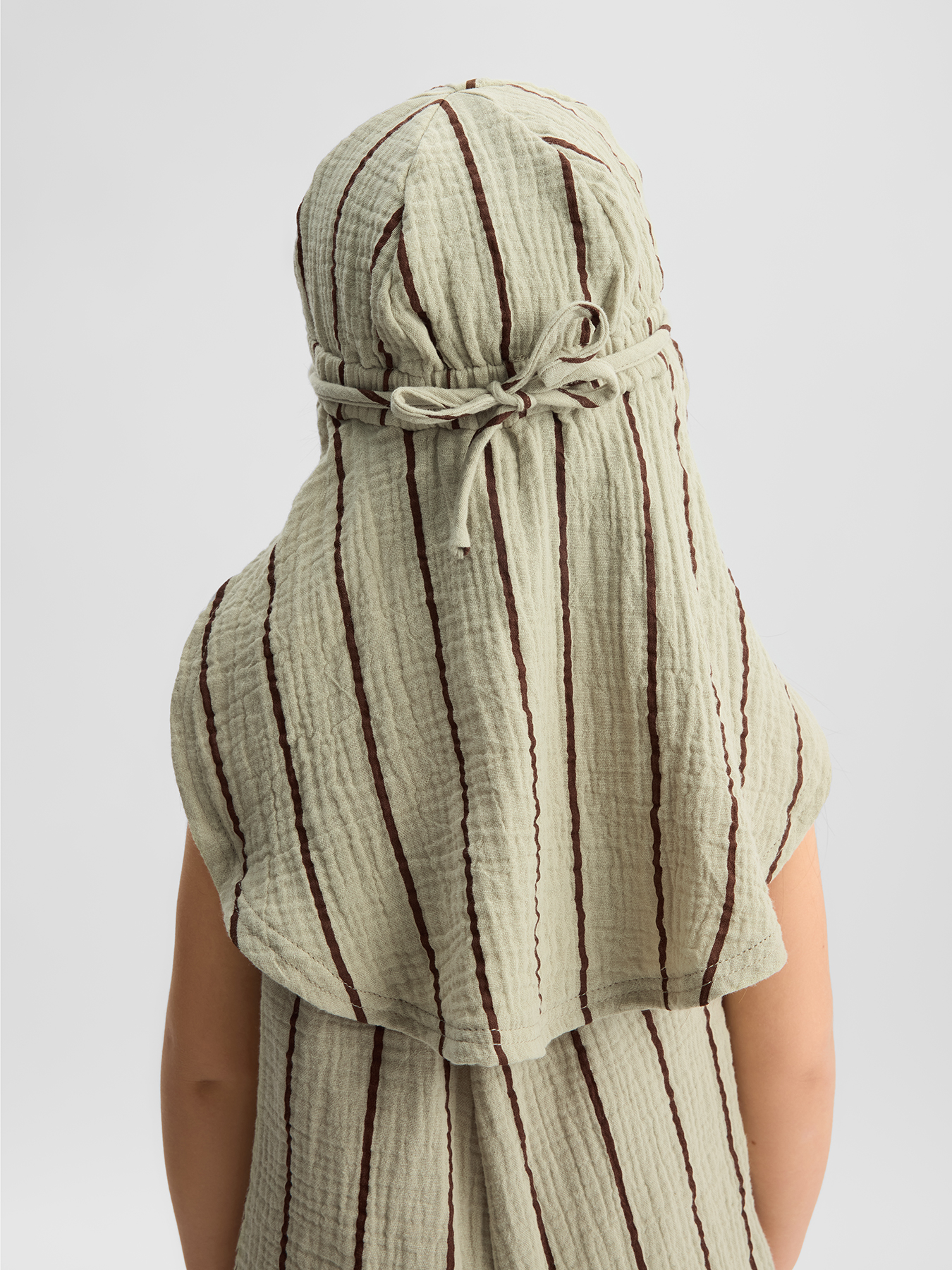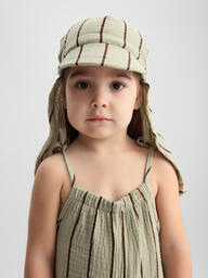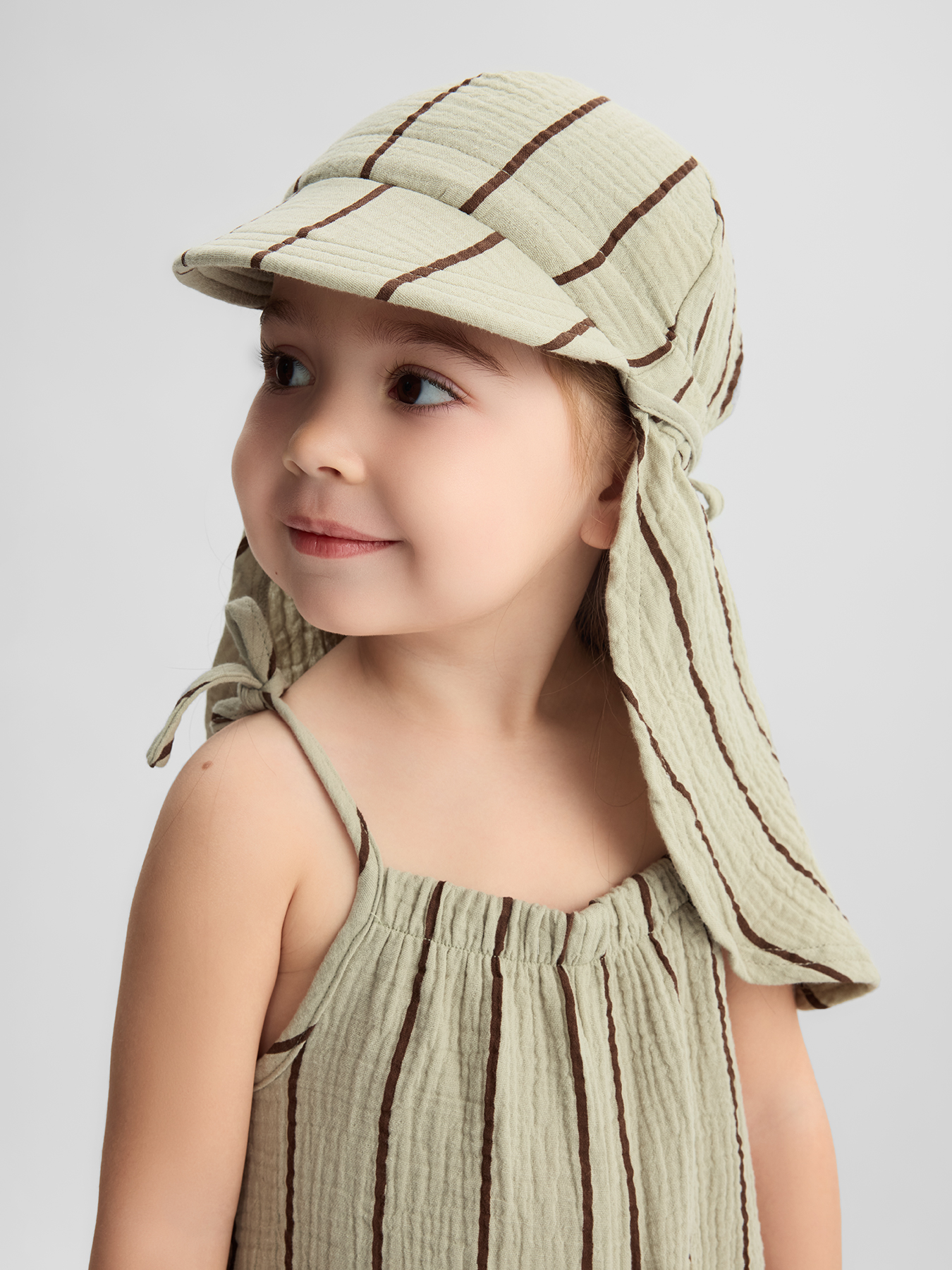 Ассиметричная хлопковая панама надежно защищает от солнца. Козырек спереди защищает лицо от солнца, а удлиненные поля сзади прикрывают плечи и шею, обеспечивая дополнительный комфорт. Завязки фиксируют панаму, предотвращая ее спадание даже во время активных игр. Выполнена в трендовых цветах и станет гармоничным дополнением к любому городскому образу.