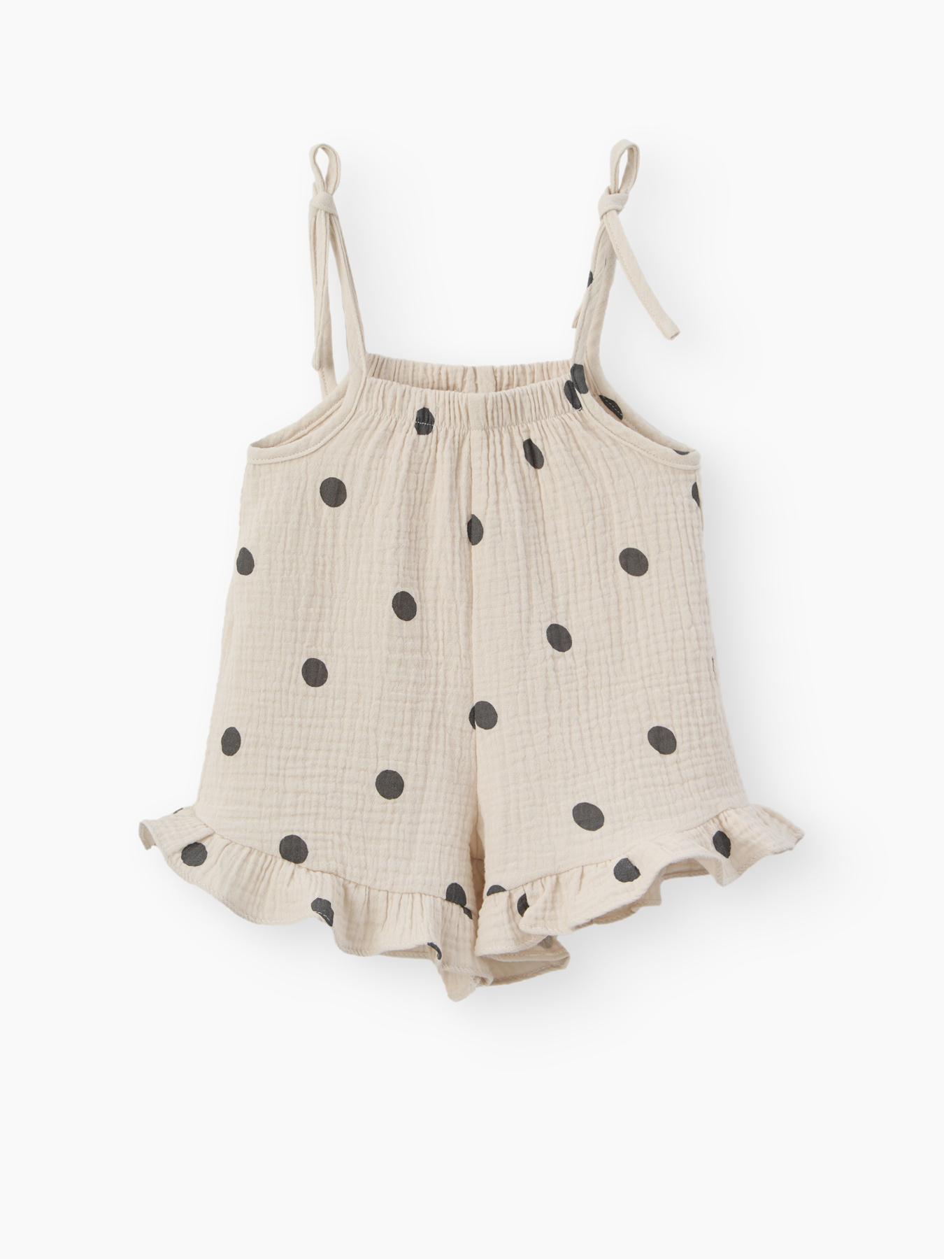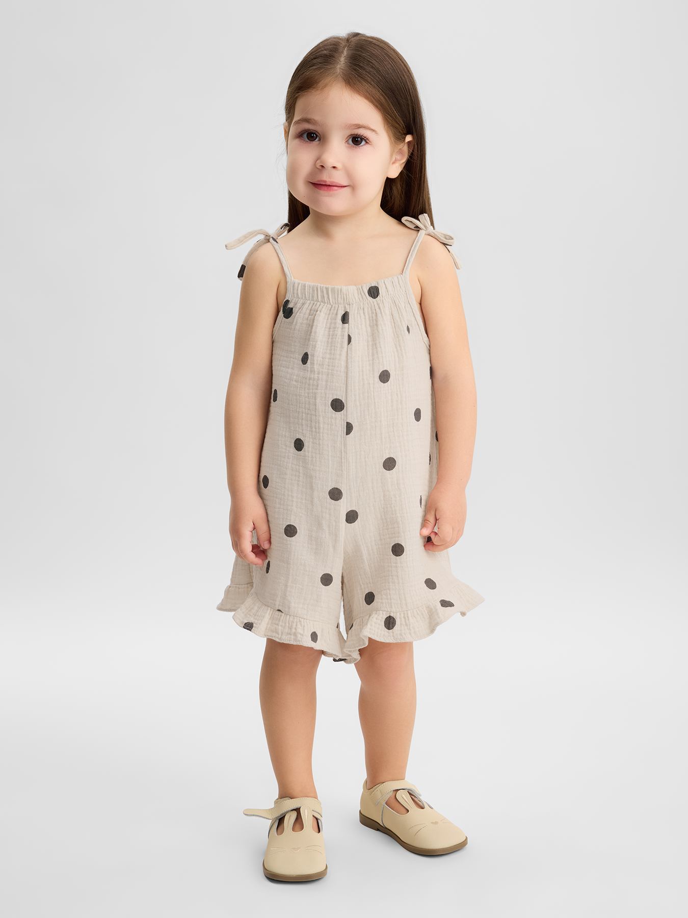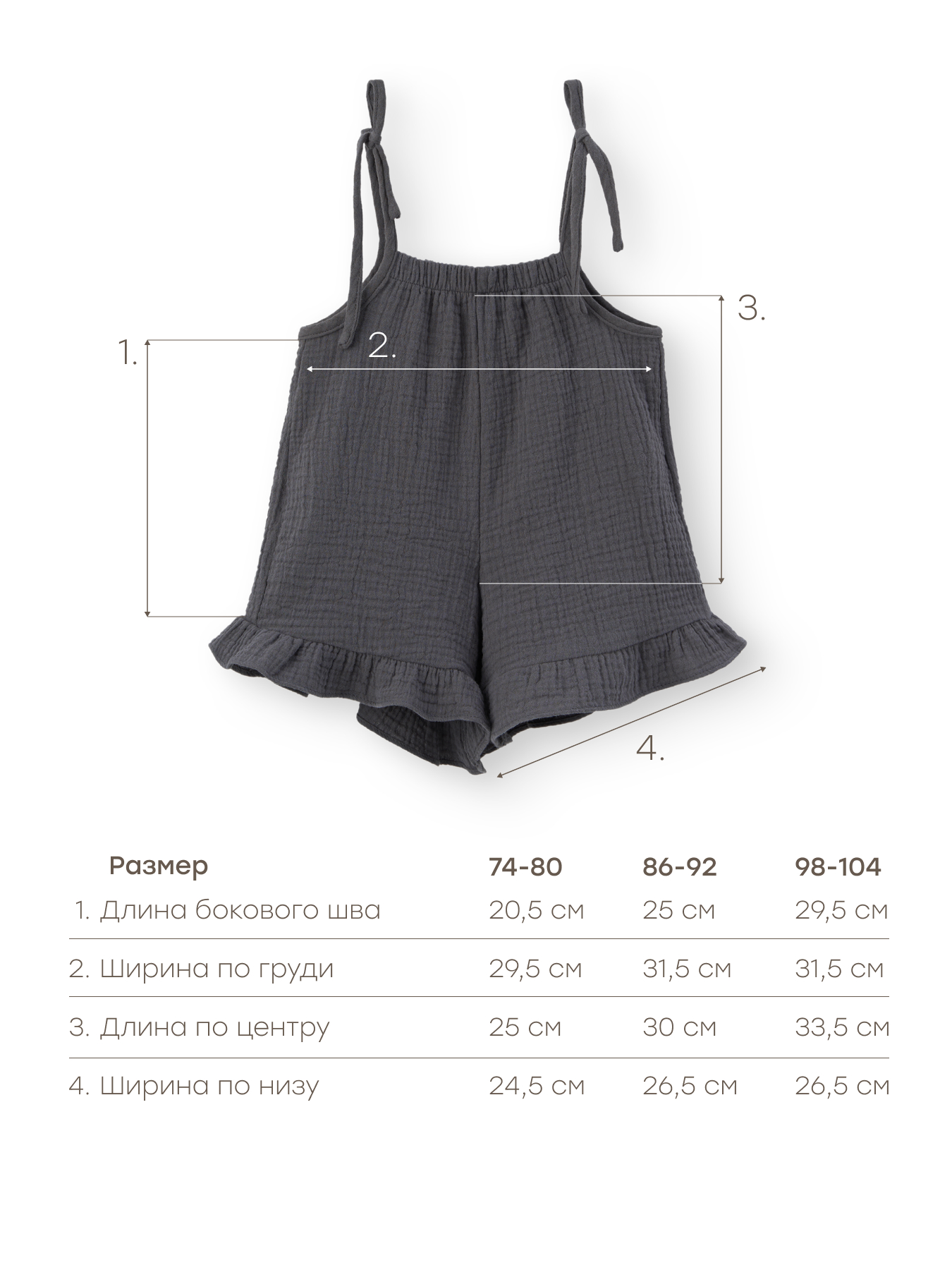 Летний комбинезон – одна из самых удобных вещей для самых маленьких. Свободный крой не сковывает движения, есть пространство под подгузник. Благодаря завязкам можно легко отрегулировать посадку по фигуре. Изделие сшито из 100% хлопковой ткани, которая отводит влагу, дышит, не натирает и не электризуется. Комбинезон можно носить с любыми топами или без них.