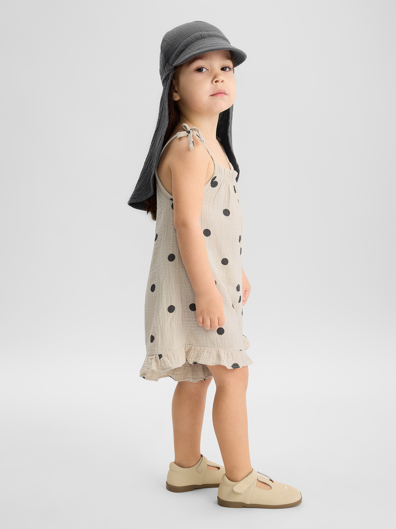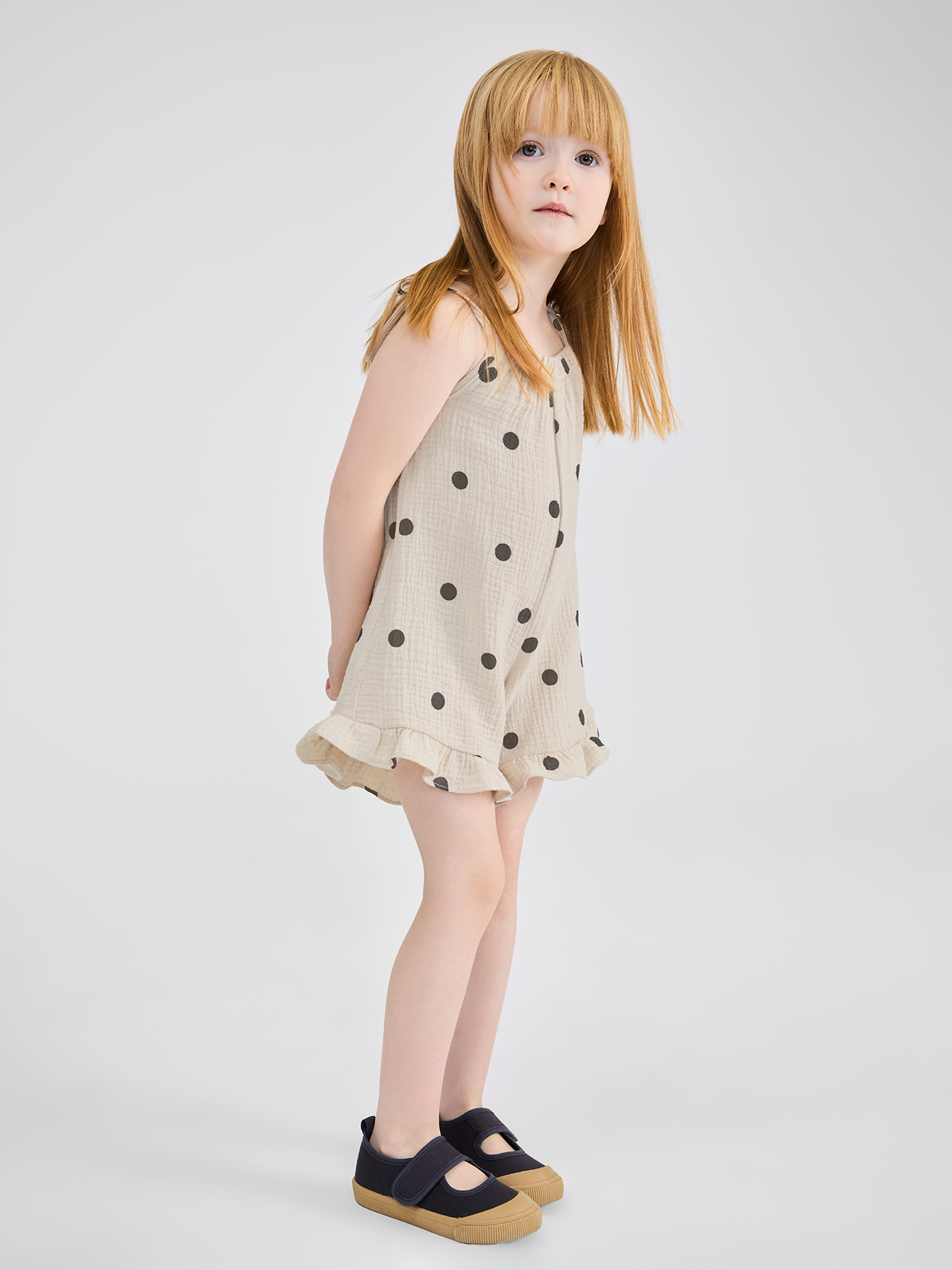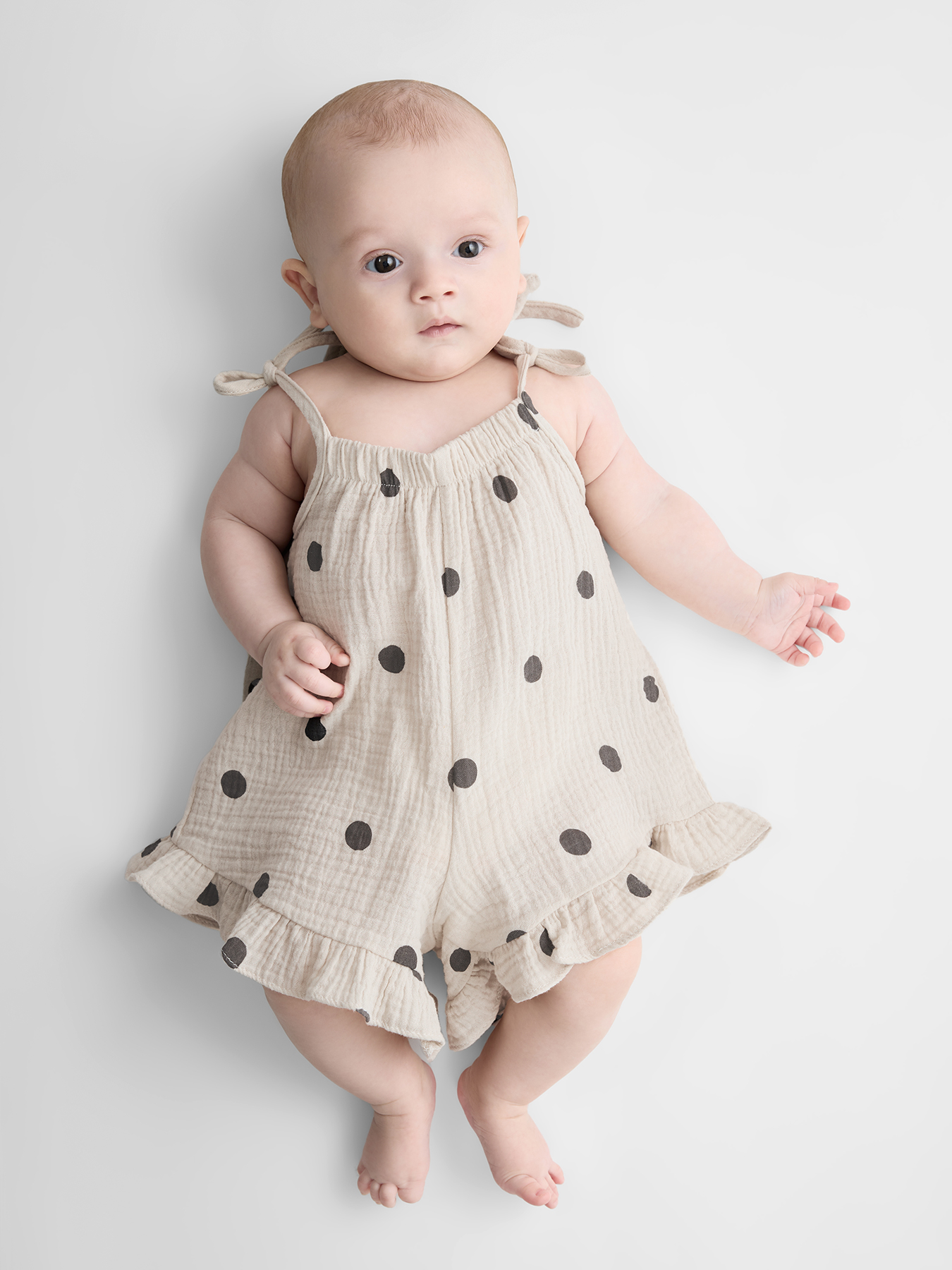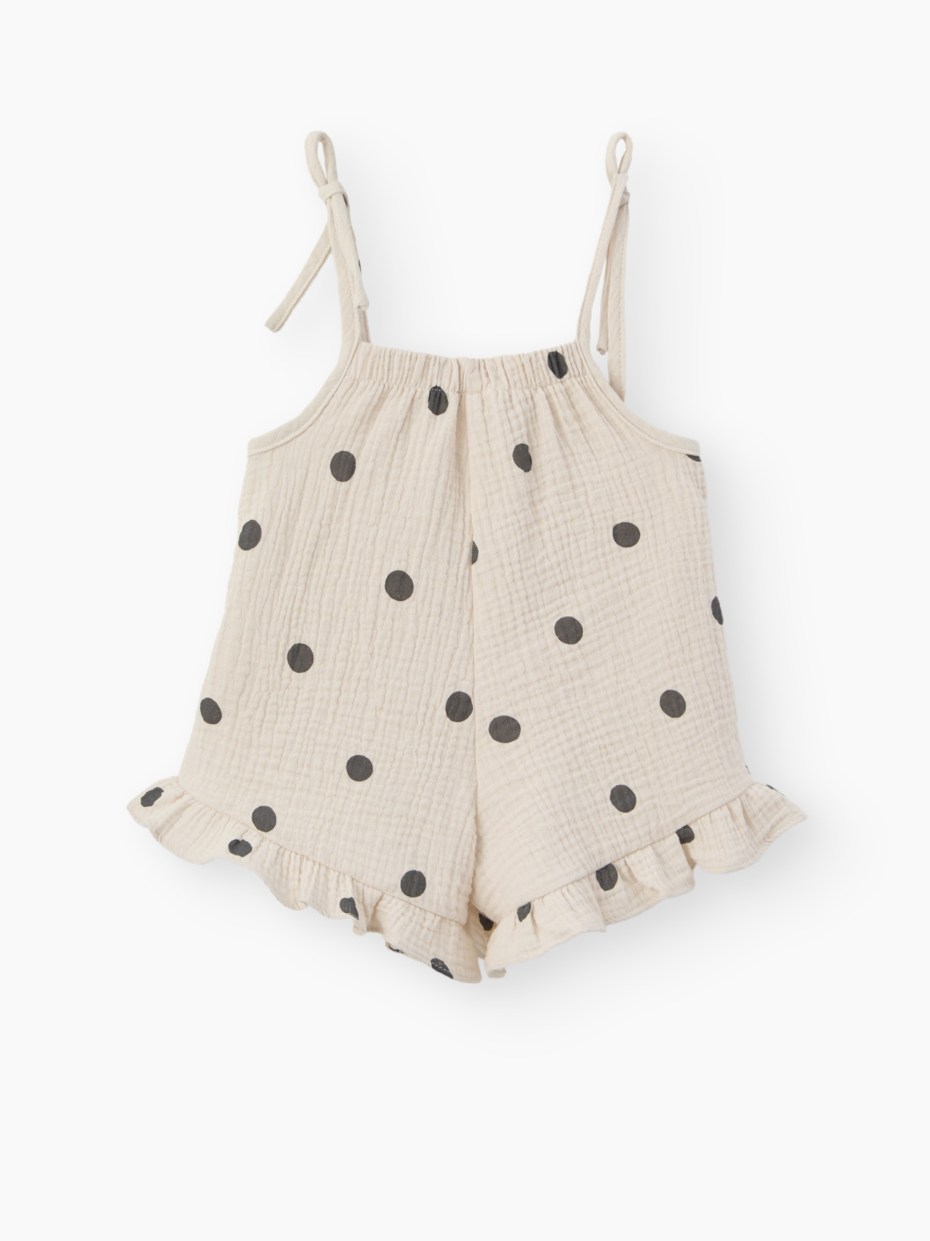 Летний комбинезон – одна из самых удобных вещей для самых маленьких. Свободный крой не сковывает движения, есть пространство под подгузник. Благодаря завязкам можно легко отрегулировать посадку по фигуре. Изделие сшито из 100% хлопковой ткани, которая отводит влагу, дышит, не натирает и не электризуется. Комбинезон можно носить с любыми топами или без них.