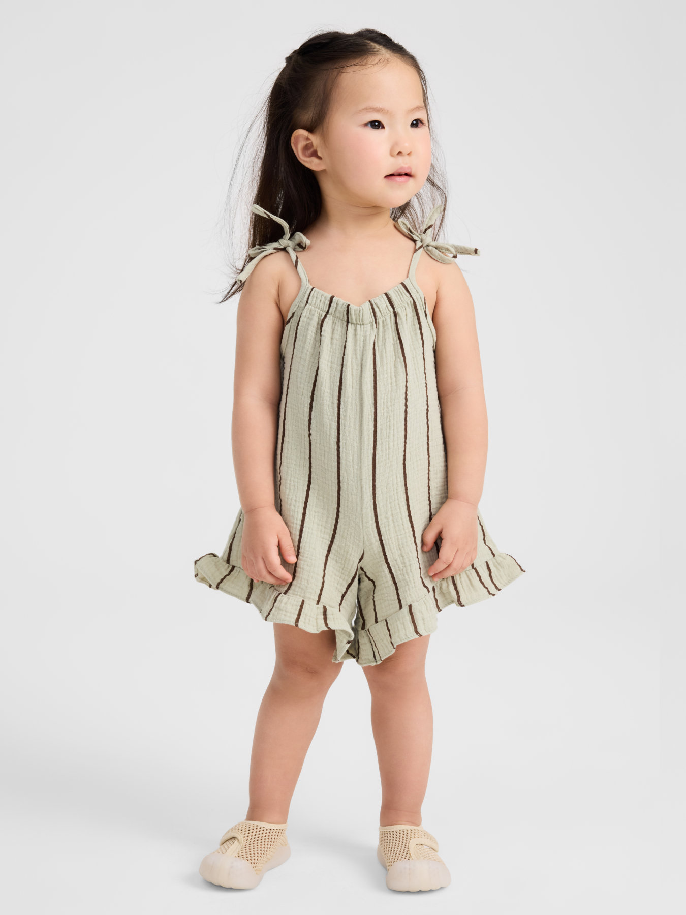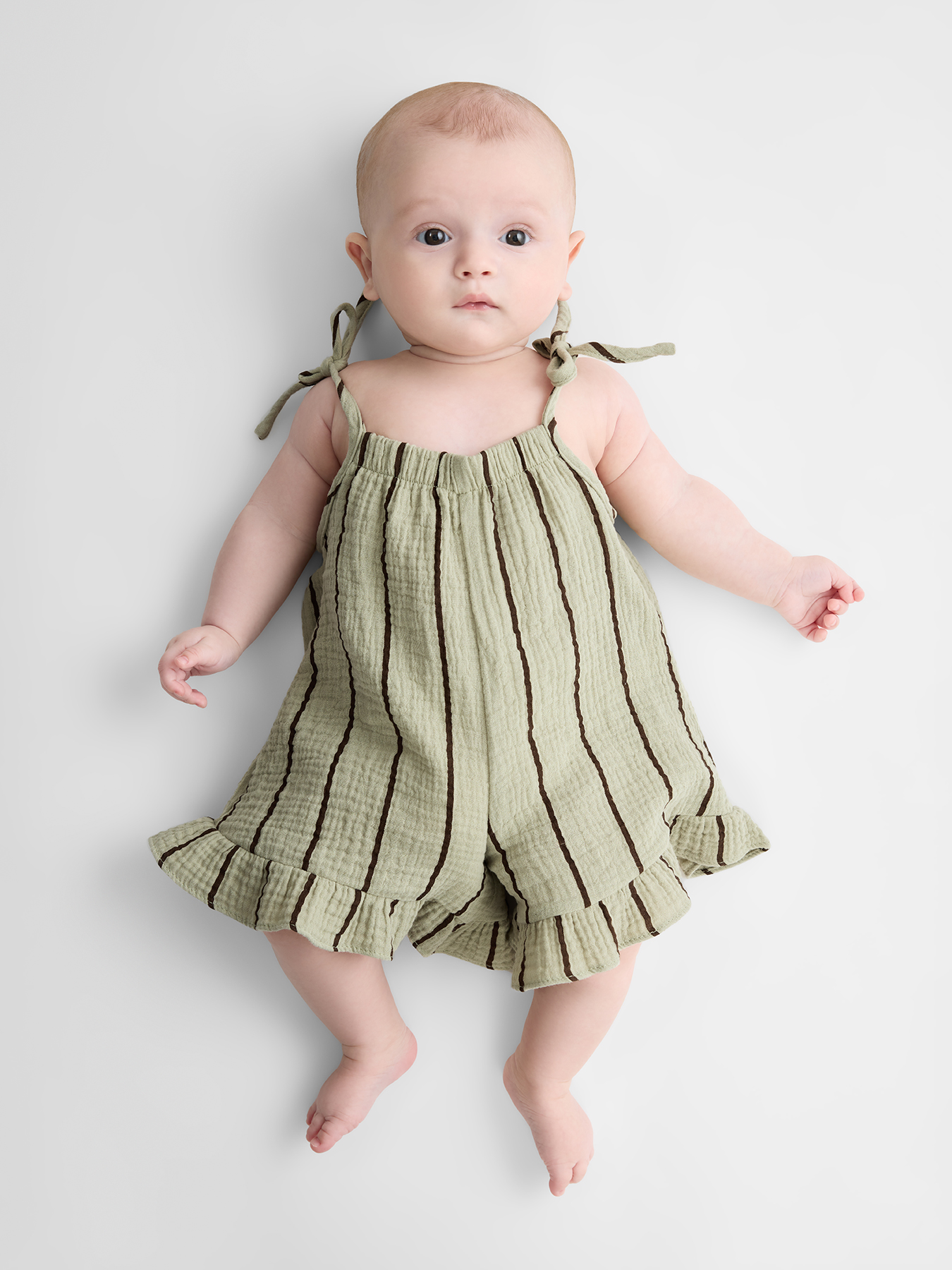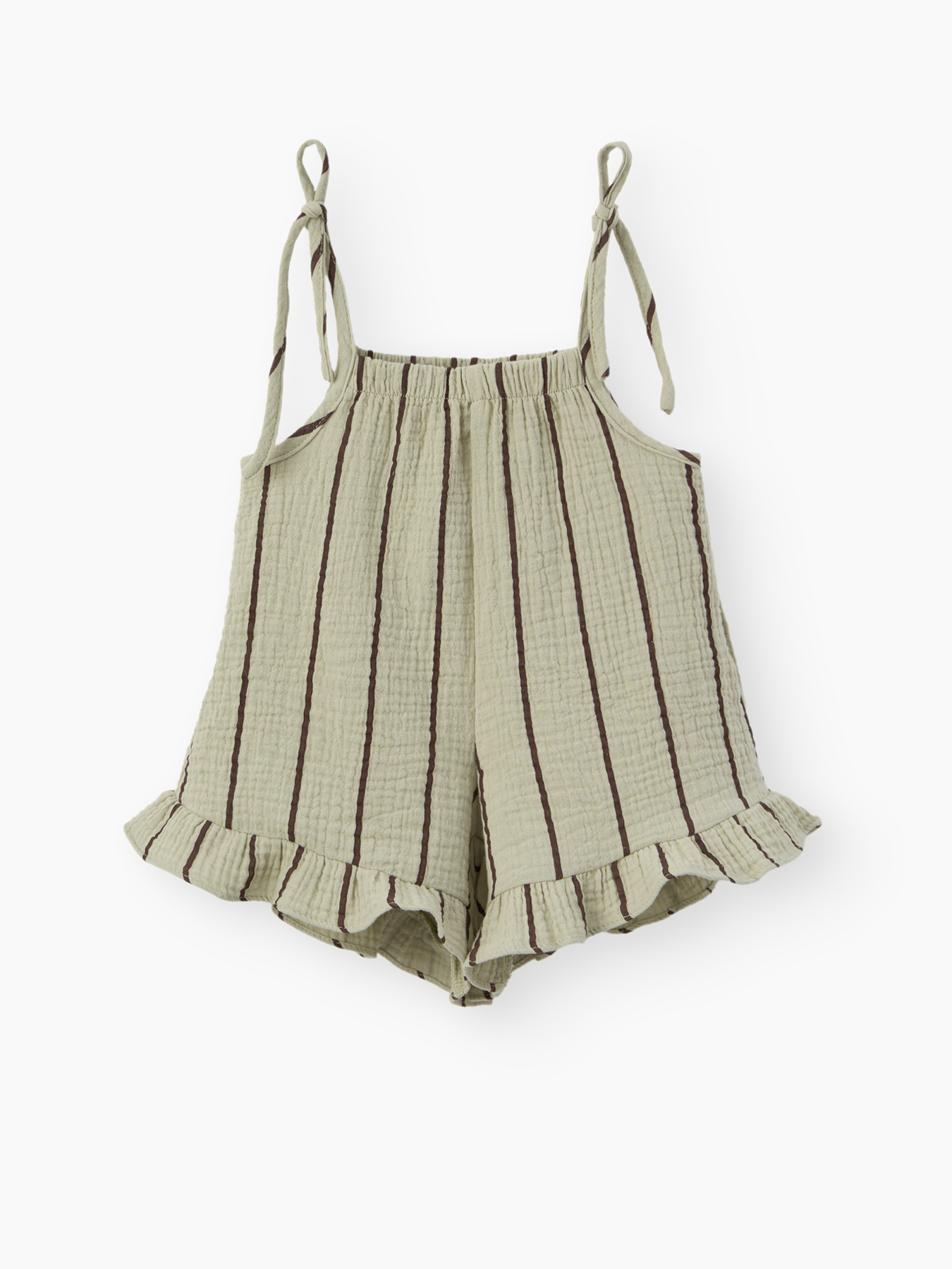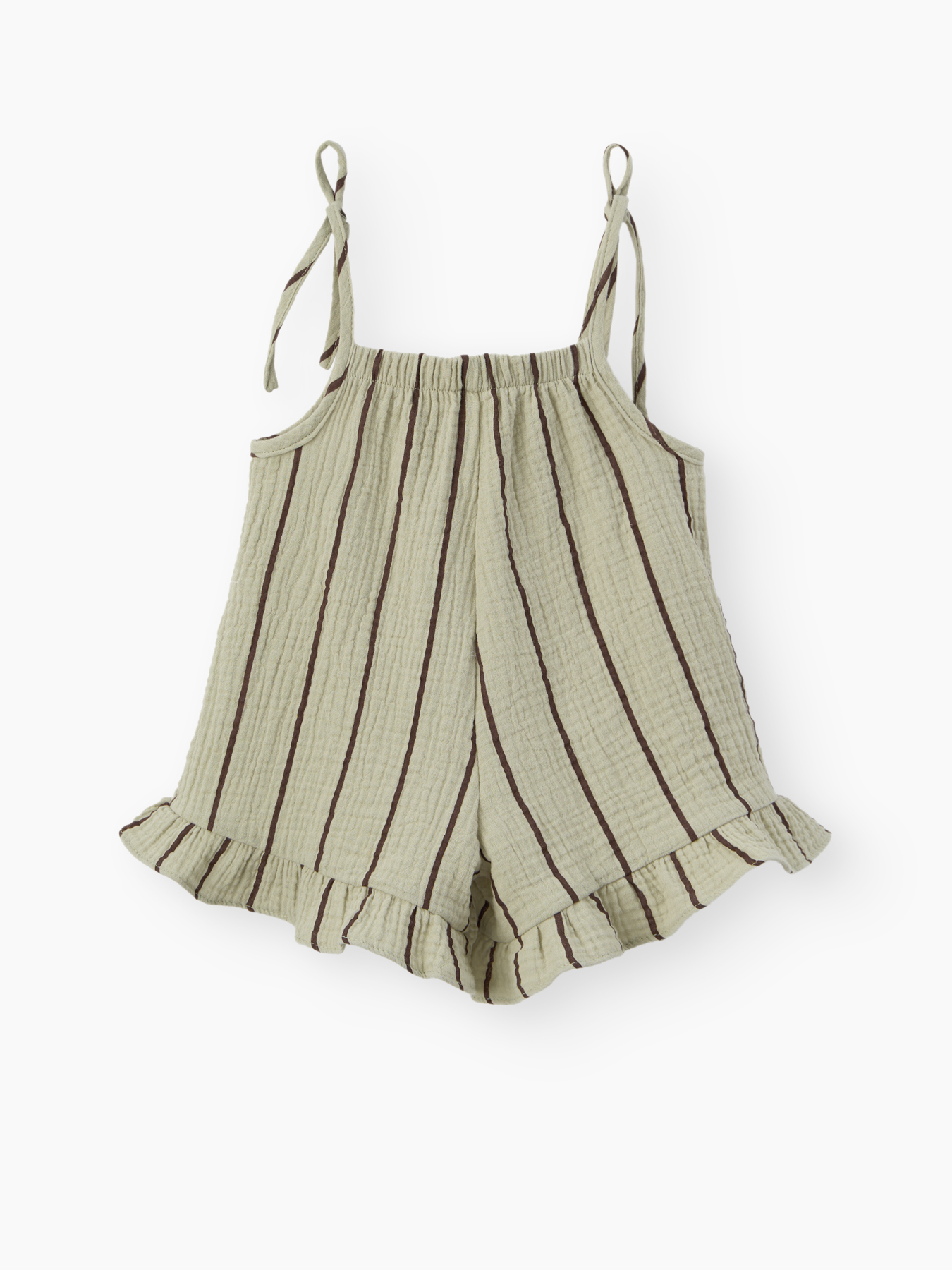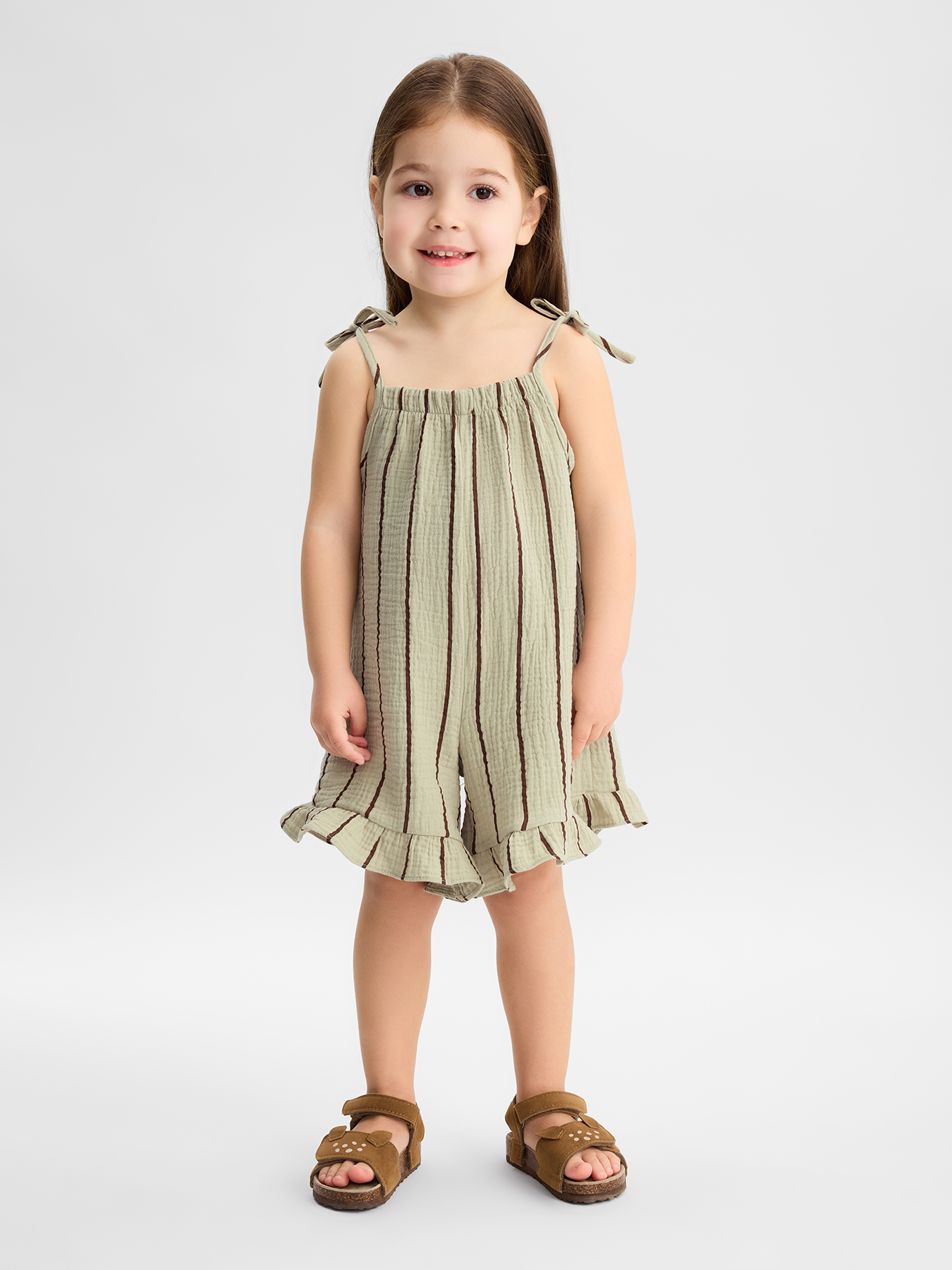 Летний комбинезон – одна из самых удобных вещей для самых маленьких. Свободный крой не сковывает движения, есть пространство под подгузник. Благодаря завязкам можно легко отрегулировать посадку по фигуре. Изделие сшито из 100% хлопковой ткани, которая отводит влагу, дышит, не натирает и не электризуется. Комбинезон можно носить с любыми топами или без них.