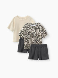 Набор из двух пижам с футболкой и шортами создан для комфортного сна и отдыха. Нежный 100% хлопок делает ткань мягкой, воздухопроницаемой и приятной к коже малыша. Легкий трикотаж обеспечивает оптимальный комфорт в любое время года, позволяя коже дышать. Свободный крой не стесняет движений, а эластичный пояс на шортах не давит на животик. Яркий и стильный дизайн с принтами делает пижаму не только удобной, но и красивой — в ней ребенок будет уютно себя чувствовать как дома, так и на отдыхе. Такая пижама станет любимой деталью гардероба и отлично подойдет для сна, игр и уютных вечеров.