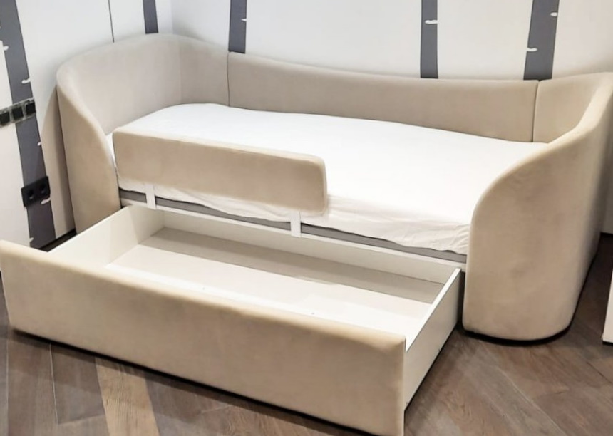 Оснащен вместительным ящиком для хранения постельных принадлежностей или игрушек