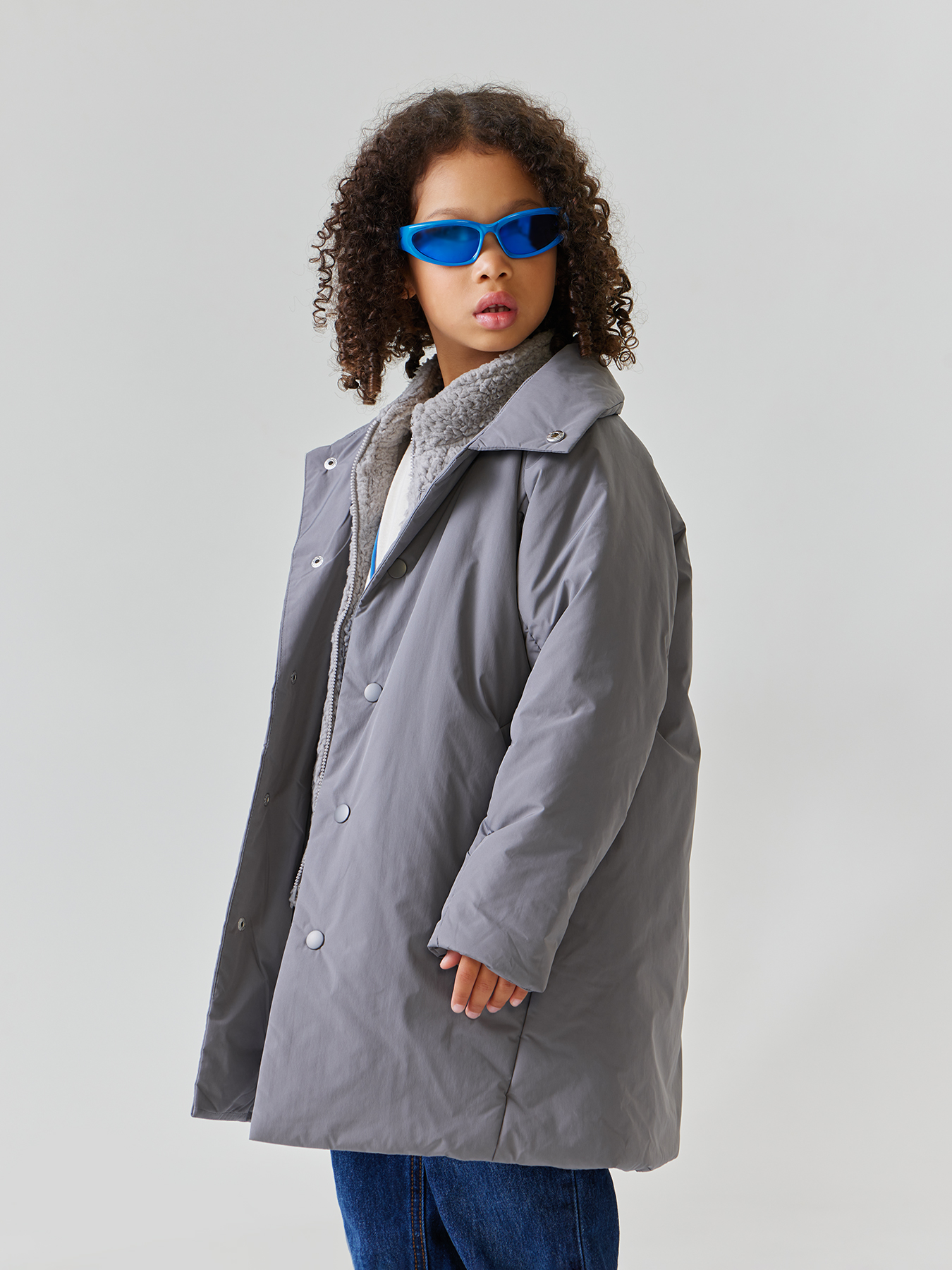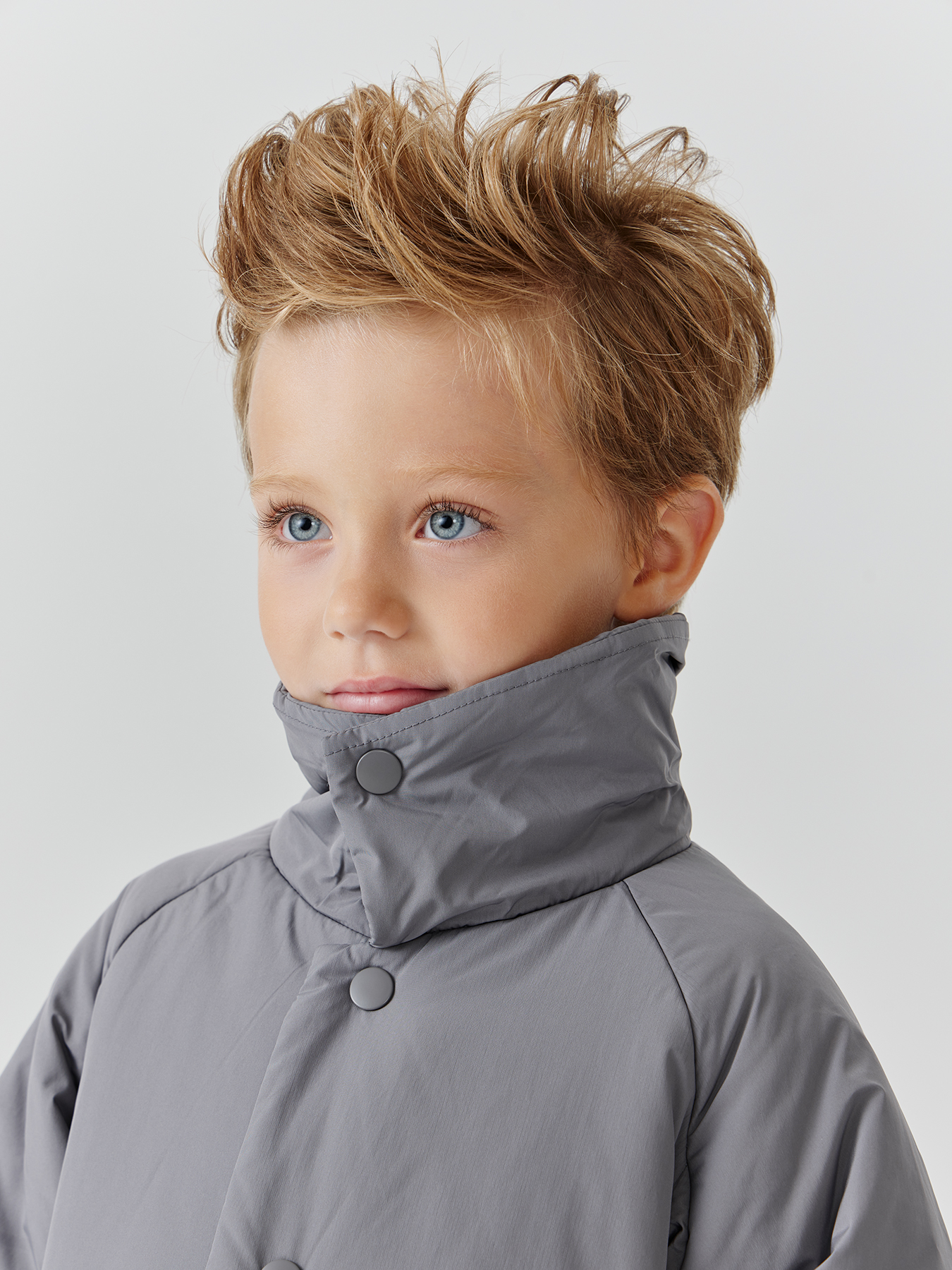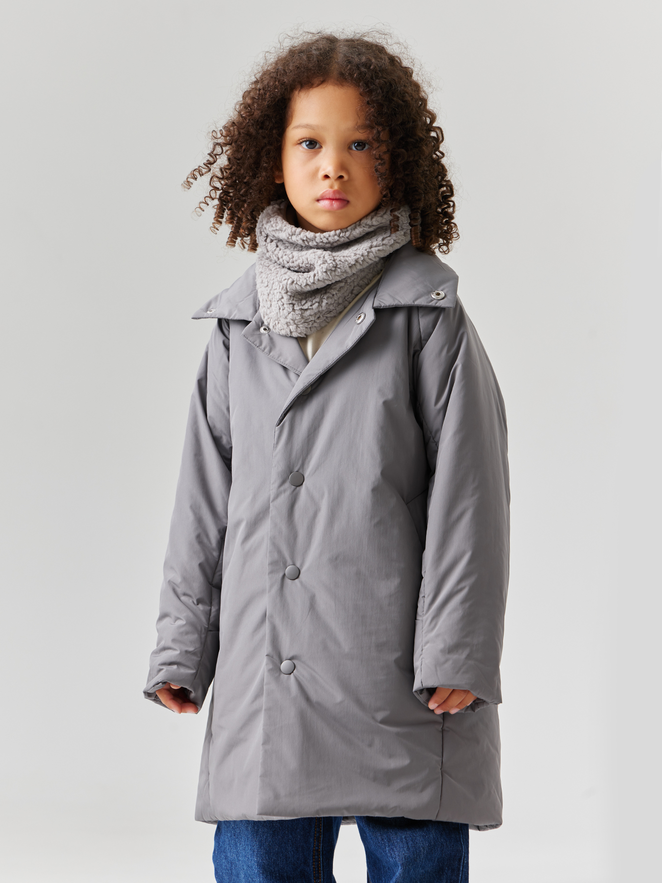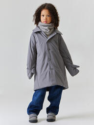 Утепленное пальто — идеально для создания утонченных образов. Практичность изделия достигается благодаря материалам — сверху влагоотталкивающая ткань, внутри — легкий утеплитель полиэфир. Благодаря особому крою рукавов с вшитыми варежками, ребенок больше не забудет и не потеряет свои рукавицы. Высокий отложной воротник защищает шею от холода и ветра. Пальто удобно застегивается на молнию.