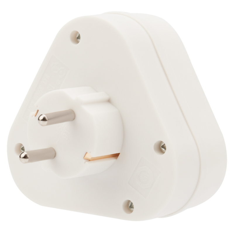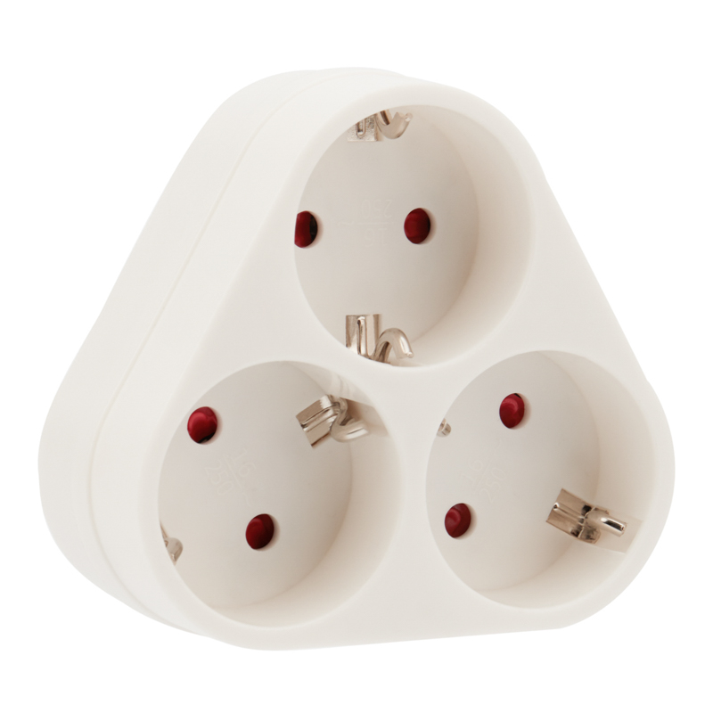 Тройник электрический пирамида предназначен для подключения к электрическим сетям с напряжением 220 В. С его помощью вы сможете подключить сразу три электроприбора к одной розетке, будь то холодильник, электрическая плита, электрический чайник, лампа, вентилятор, светильник и другие приборы бытового назначения.