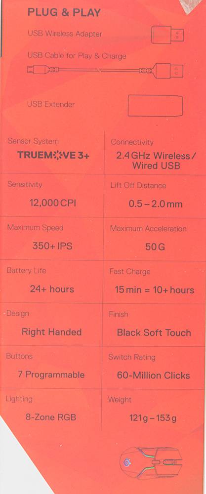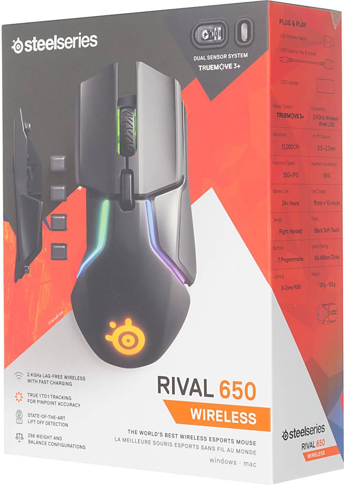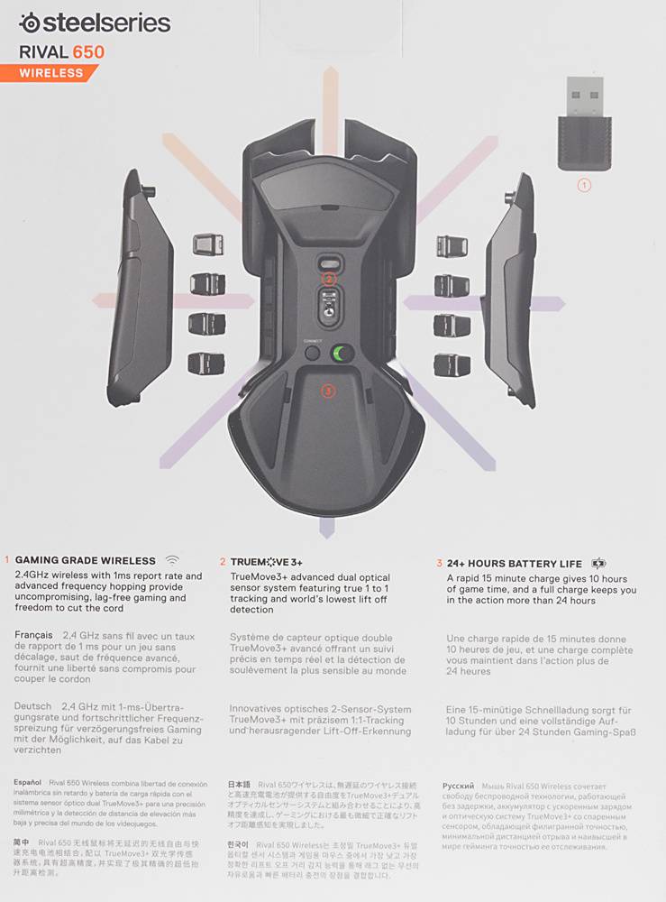 • Комплектация Мышь Rival 650, USB-передатчик, USB-кабель, 8 четырехграммовых гирь, документация