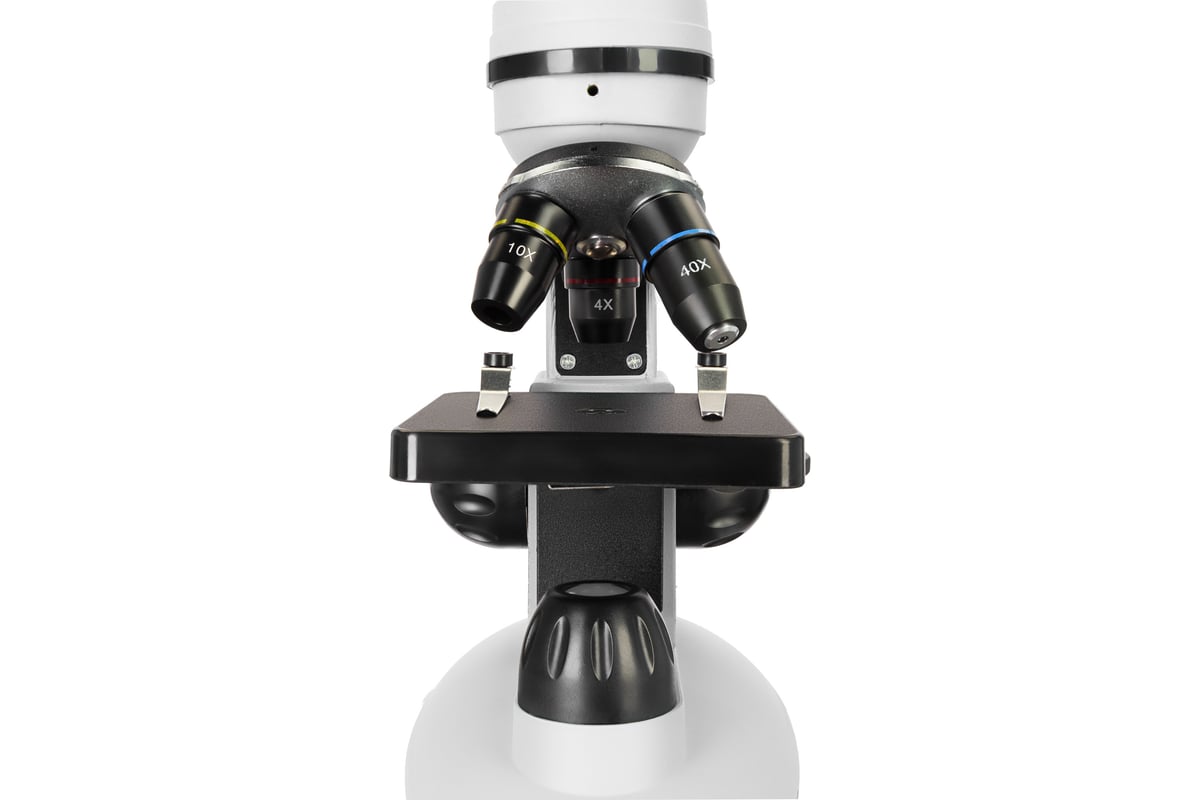Оптика микроскопа – это монокулярная насадка с широкопольным объективом 10х и револьверное устройство с тремя ахроматическими объективами 4х, 10х и 40х, причем объектив 40х подпружинен. Все оптические элементы сделаны из стекла, поэтому передают четкую и ясную картинку.