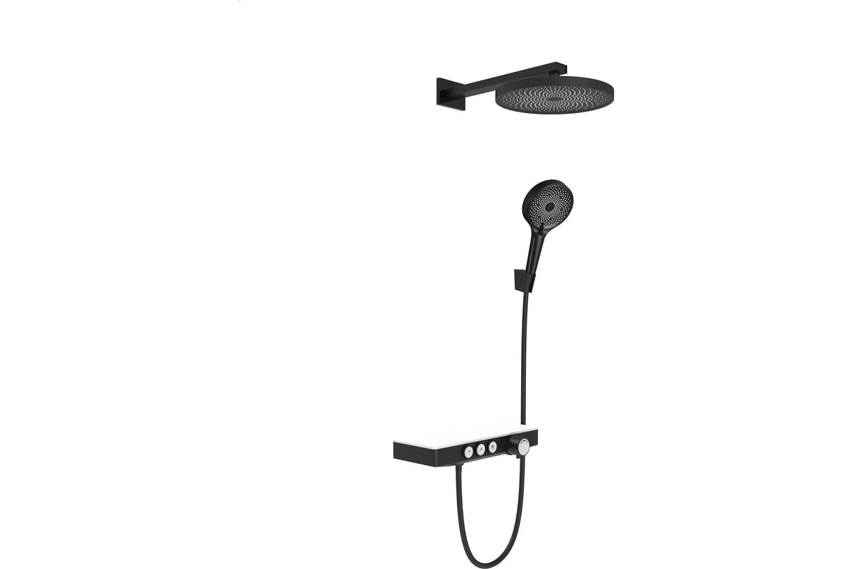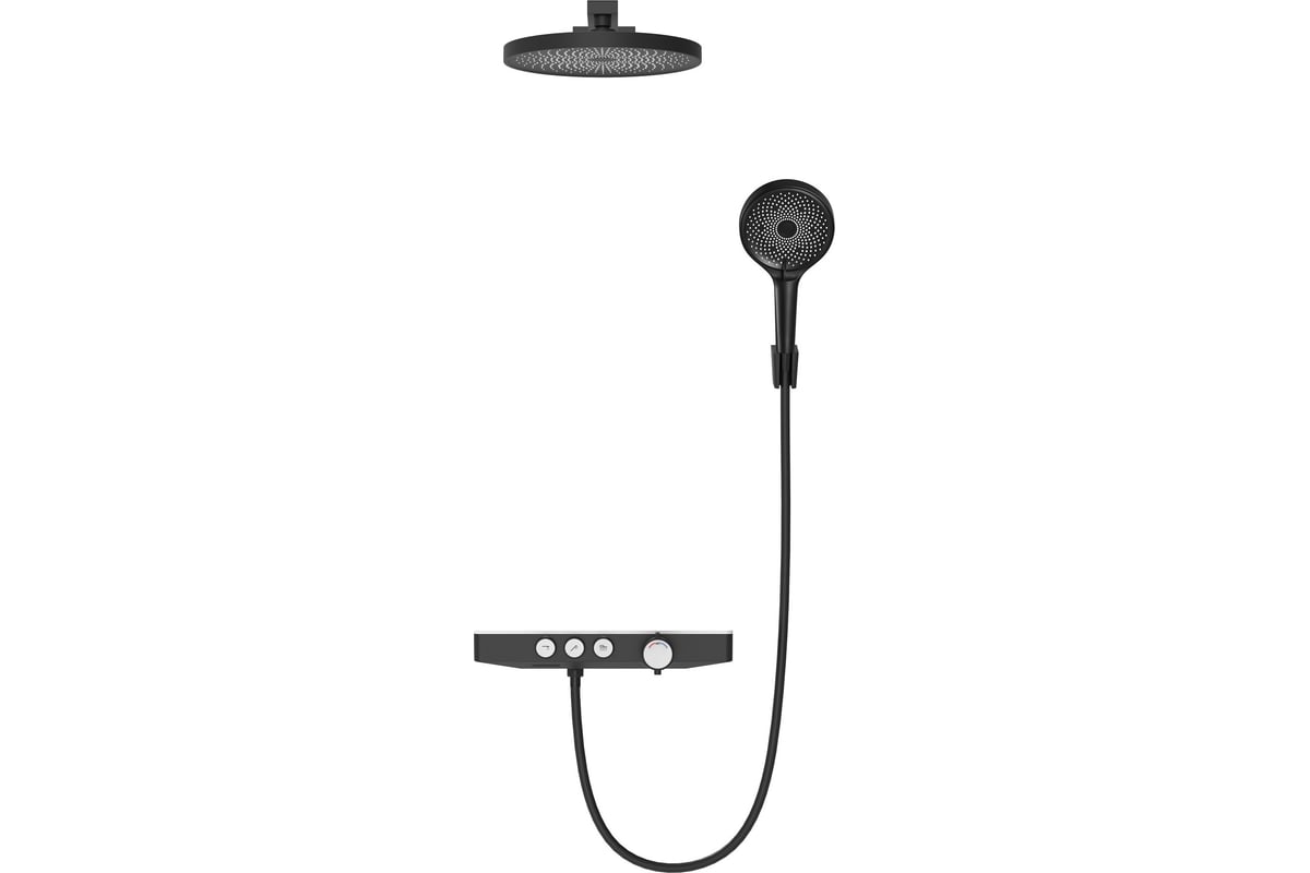 Душевой комплект Berges MORANS с изливом и термостатом, черный матовый 075004 - встраиваемый душевой комплект обладает трёхрежимной системой и включает в себя: верхний душ «Тропический ливень», ручной душ и излив для наполнения ванны.