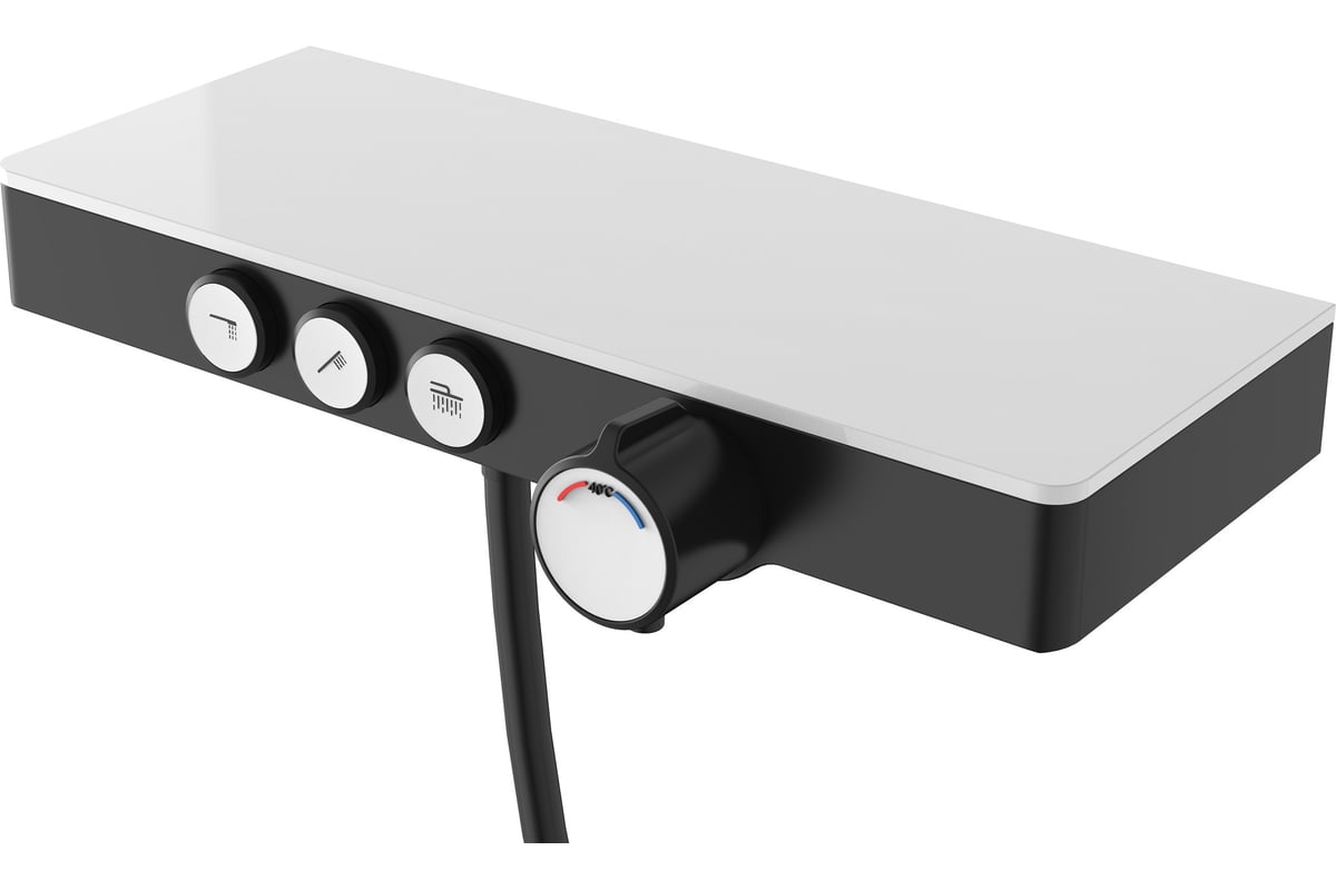 Форма корпуса смесителя выполнена в виде полочки из закаленного стекла, позволяя комфортно хранить необходимые принадлежности для душа.