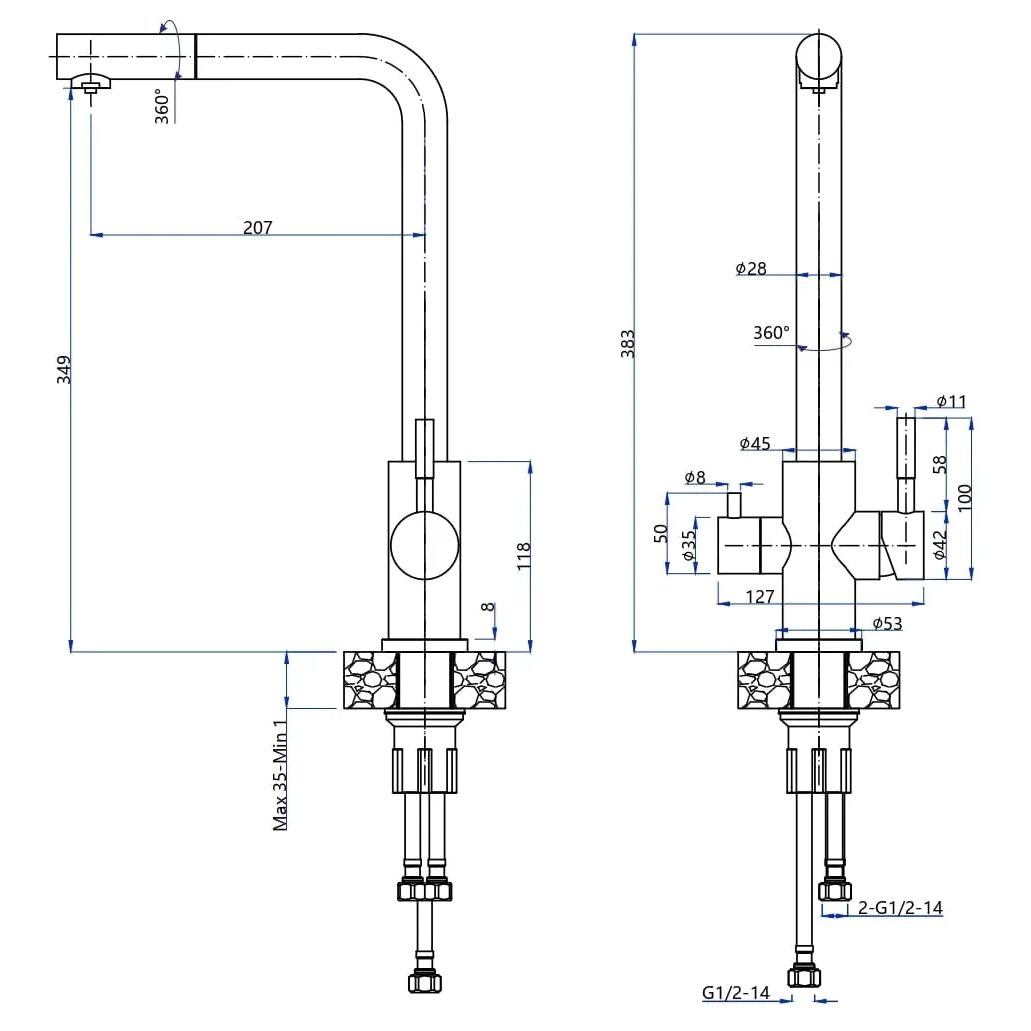 GRANFEST QUARZ Смеситель для кухни, Г-образный, кран под фильтрованную воду, серый