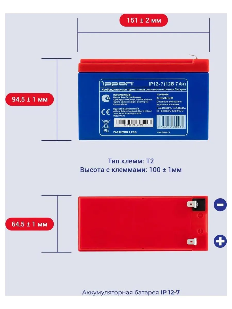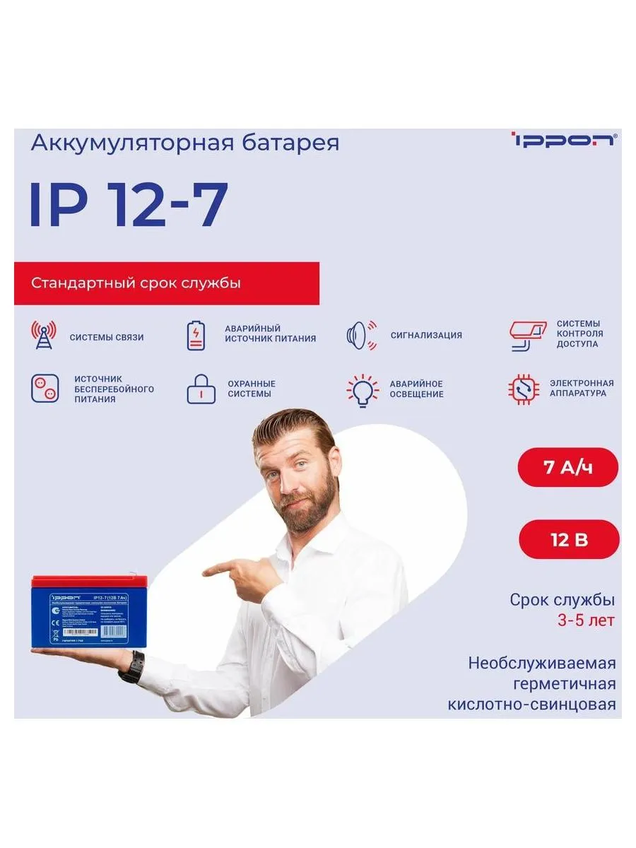 Описание товара Батарея для ИБП Ippon IPE12-7 12В 7Ач