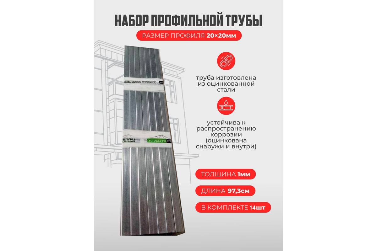 Набор металлических оцинкованных профильных труб (14 шт.) размером 20х20 мм с толщиной стенки 1 мм. Длина одной профтрубы – 97.3 см. Используется как элемент металлических конструкций: строительные леса, ограждения, опоры, заборы, колонны, мебель, перекрытия и т.д.