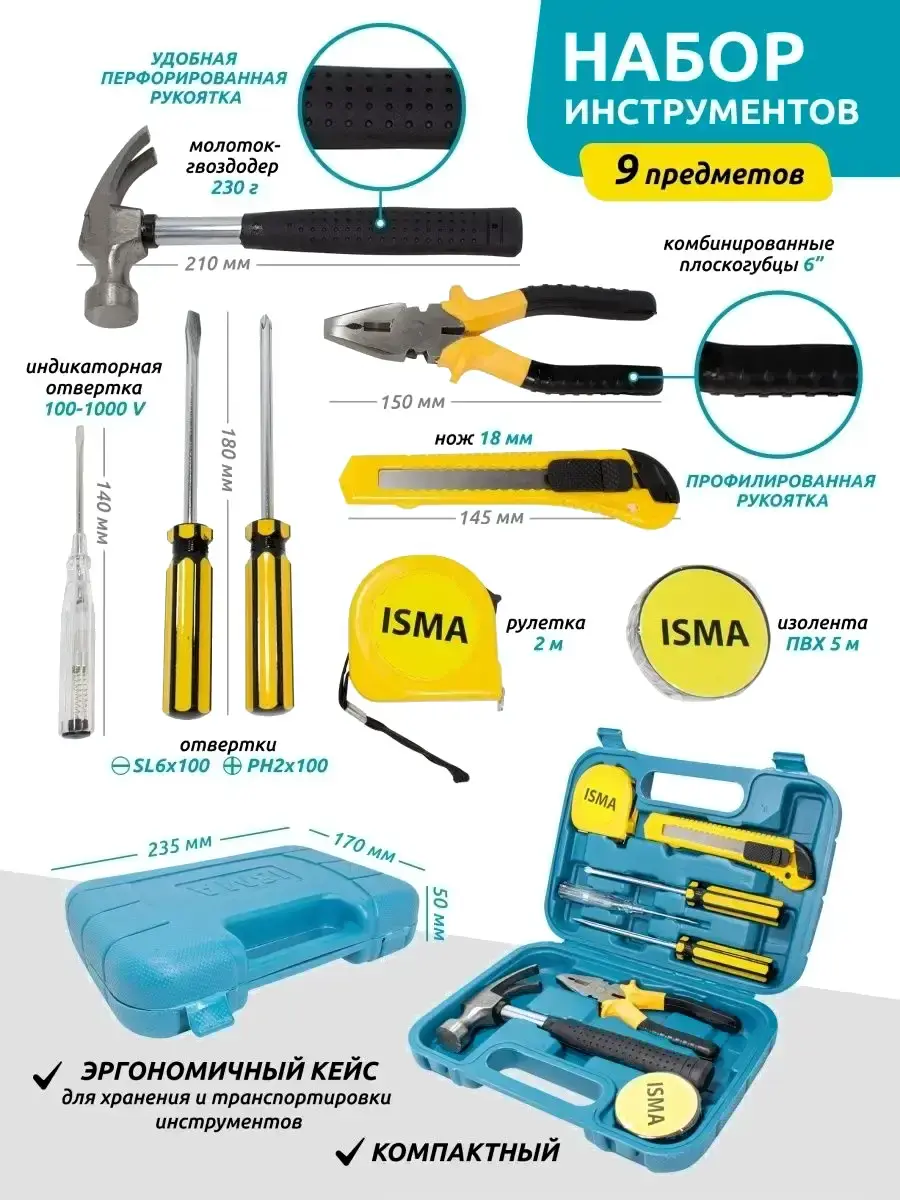 • Инструменты в наборе пассатижи (комбинированные 6"), молоток, нож (универсальный)