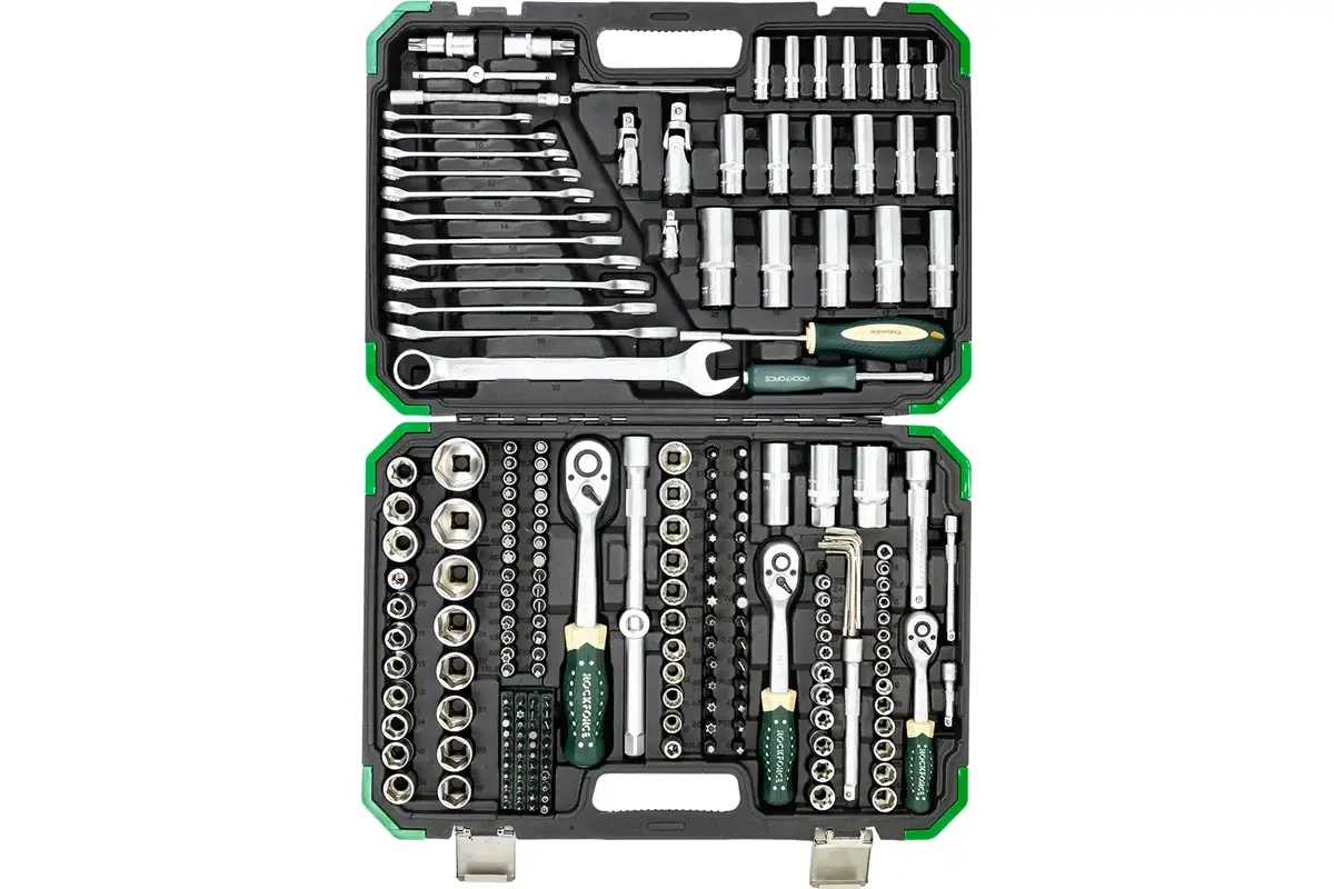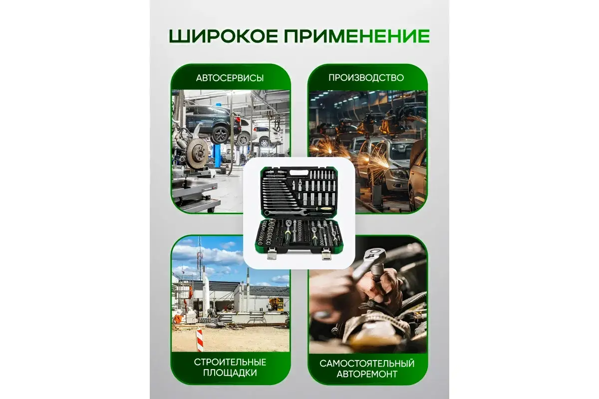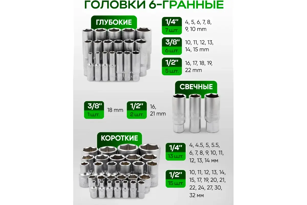 • Глубокие торцевые головки 1/4″ (6 шт.), 3/8″ (6 шт.), 1/2″ (5 шт.)
