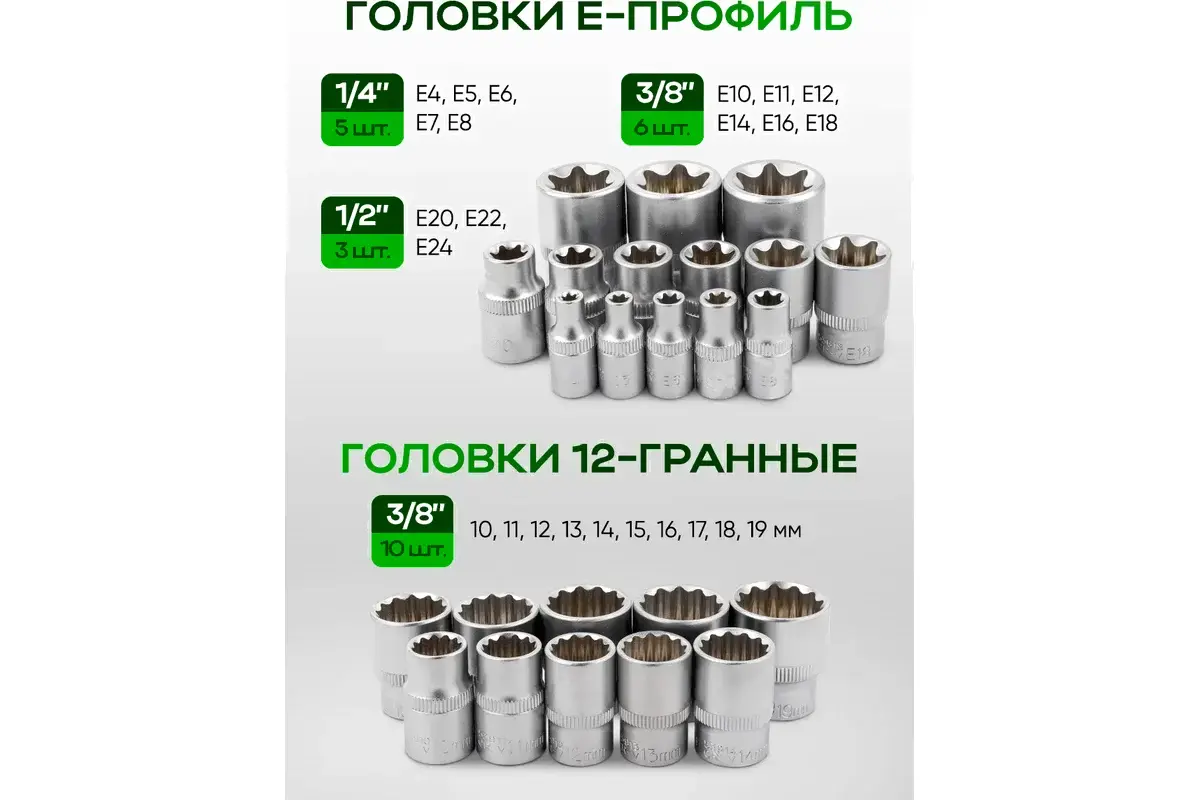 • Торцевые головки E-тип 1/4″ (5 шт.), 3/8″ (6 шт.), 1/2″ (3 шт.)