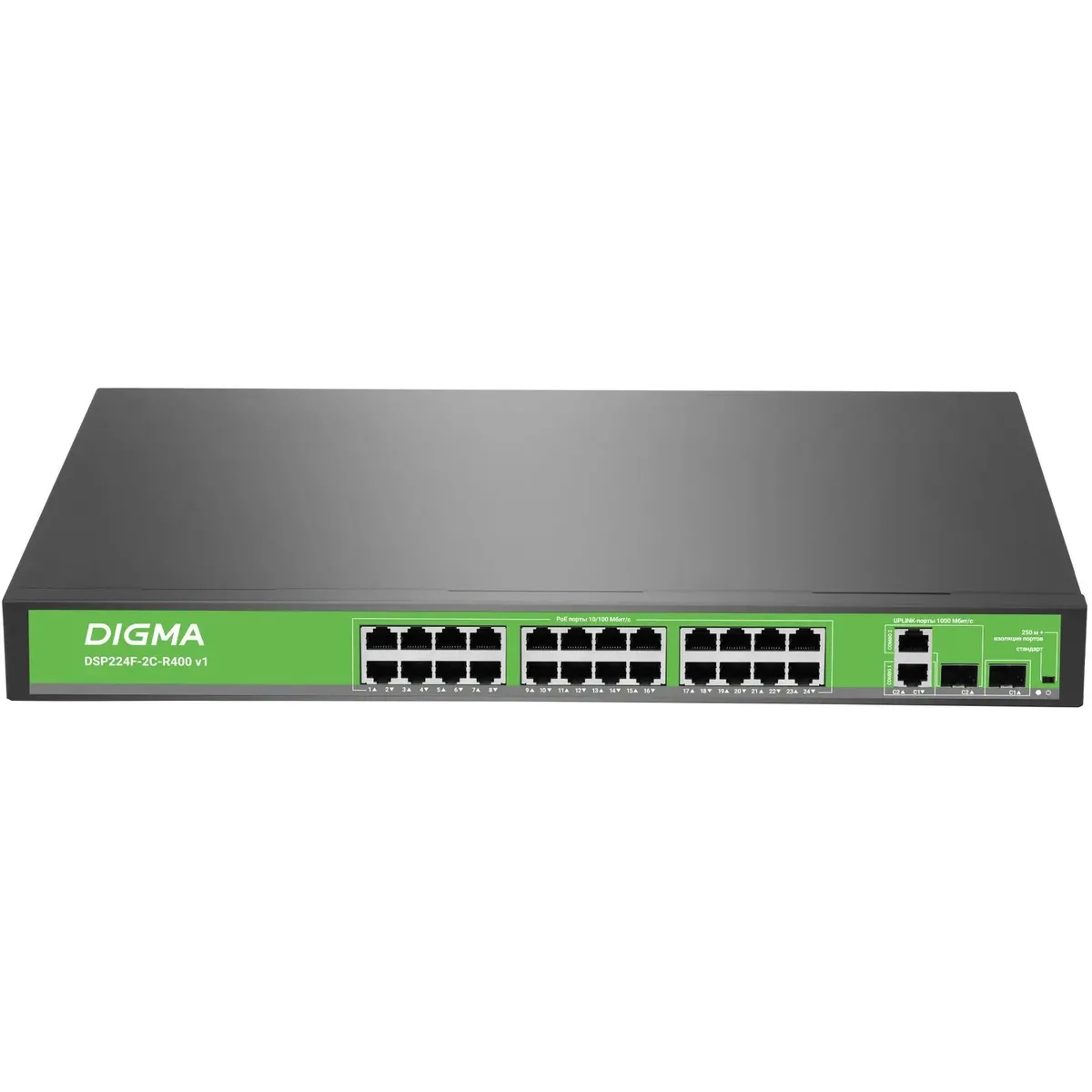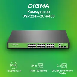 Коммутатор неуправляемый Digma DSP224F-2C-R400 V1 (L2) 24x100Мбит/с 2xКомбо (1000BASE-T/SFP) 24PoE 24PoE+ 400W