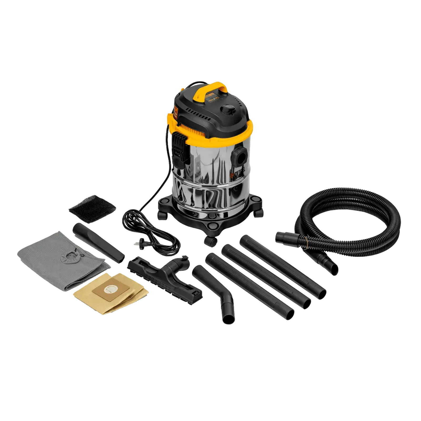 В комплектешланг-воздухопровод с адаптерами, изогнутая труба (ручка), переходник для электроинструмента (3 шт.), воздушный фильтр для сбора воды, мешок для мусора (2 шт.), руководство по эксплуатации