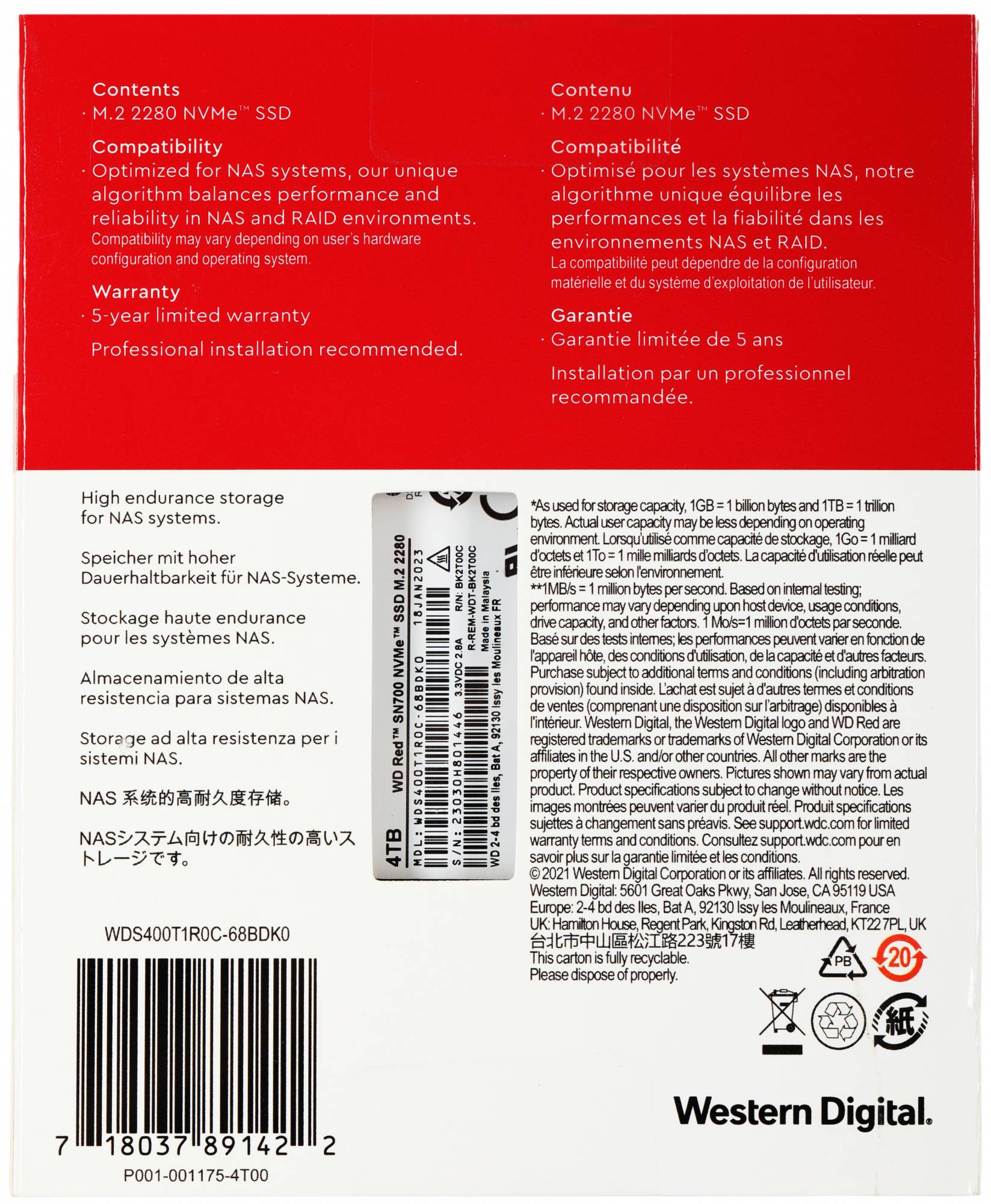Твердотельный накопитель WD Red SN700 4096ГБ, M.2 2280, PCIe 3.0 x4, M.2 WDS400T1R0C