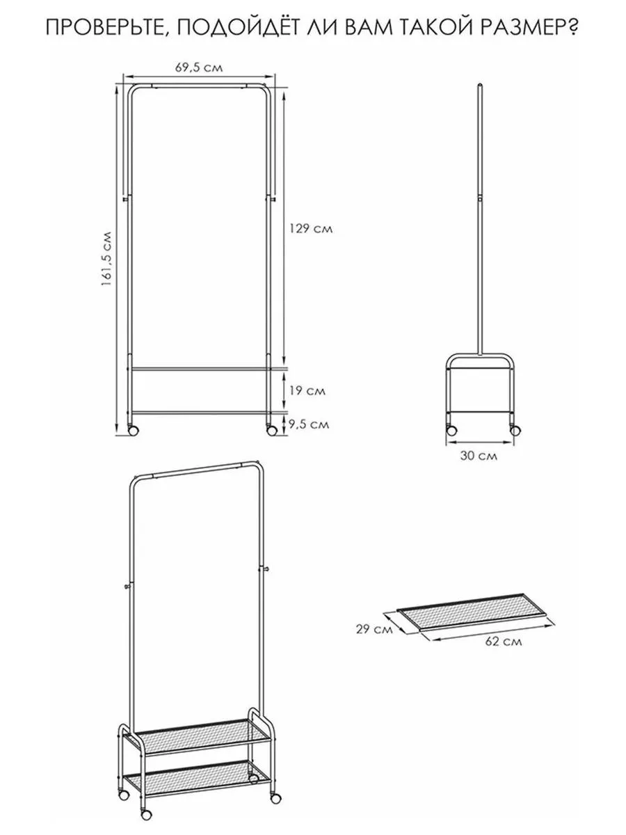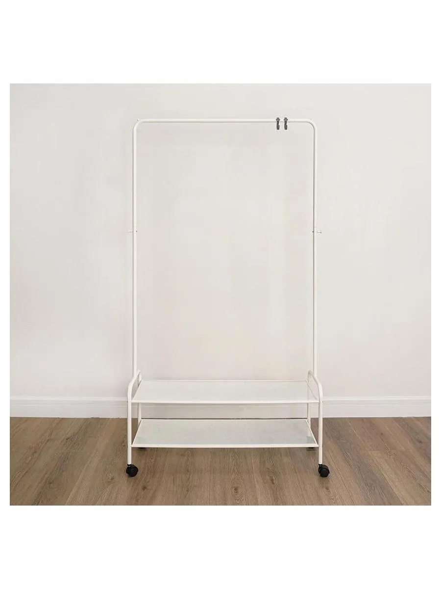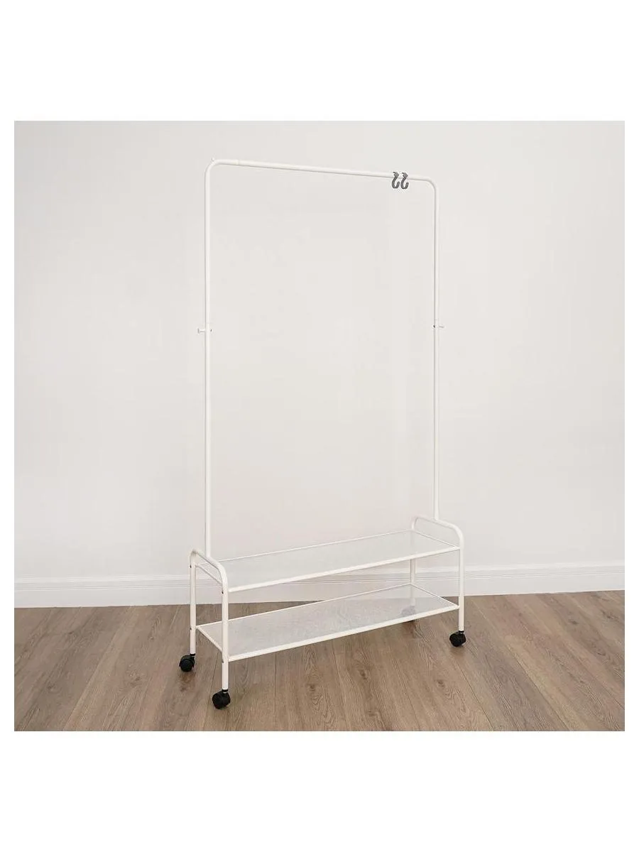 вешалка гардеробная валенсия 32м с двумя полками на колёсах, предназначена для хранения одежды и обуви, имеет сетчатые полки для обуви, легко перемещается по комнате.