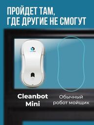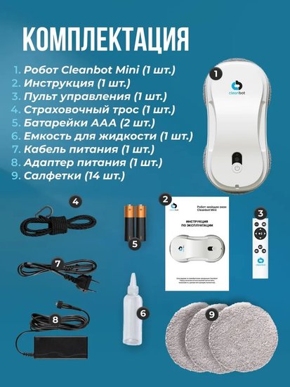 Комплектация1. Робот Cleanbot Mini 2. Салфетка из микрофибры 14 шт. (12 шт. в коробке, 2 шт. на роботе)3. Емкость для жидкости4. Батарейка ААА 2 шт.5. Страховочный шнур 4 метра6. Пульт управления 7. Адаптер питания 4 метра8. Кабель питания 1,2 метра9. Инструкция по эксплуатации.