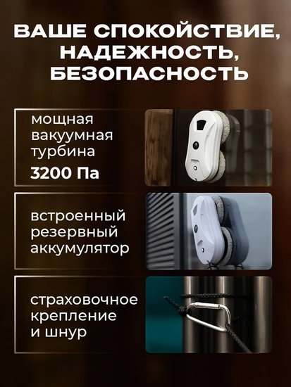 КомплектацияРобот-мойщик окон, сменные салфетки из микрофибры - 24 шт. (+2 салфетки на роботе), дополнительные кольца для салфеток - 2 шт., блок питания с удлинителем - 4 м., кабель питания - 1,5 м., страховочный шнур - 4 м., инструкция, пульт дистанционного управления..