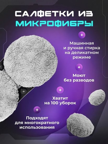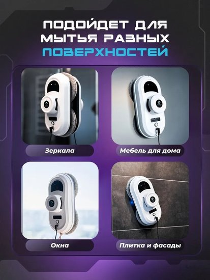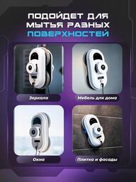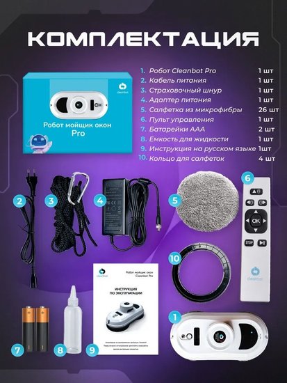 КомплектацияРобот-мойщик окон, пульт ДУ, дополнительные кольца (2 шт), адаптер со шнуром (1 м), удлинитель (4 м), салфетки из микрофибры (24 шт. + 2 на роботе), страховочный трос (4,5 м), руководство пользователя.