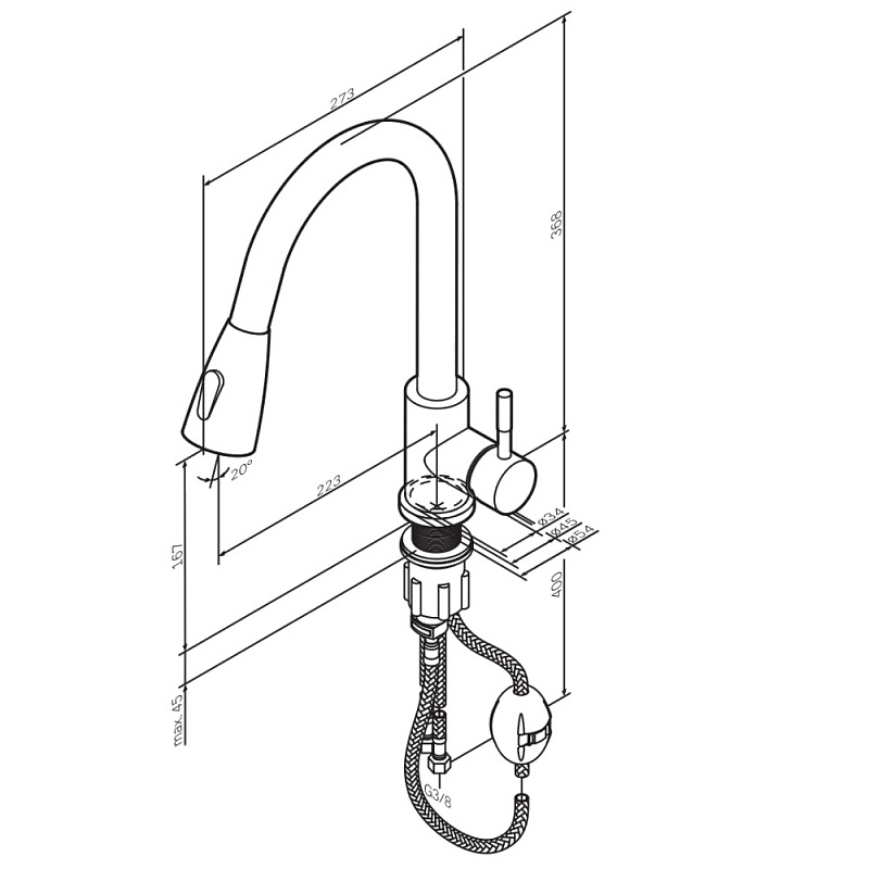 • Длина (вылет) излива 223 мм