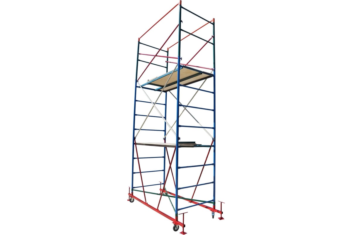 В основании мобильных подмостей лежат маршевые рамы, высота которых наращивается при стыковке методом «труба в трубу». Для предотвращения обвала конструкций, рамы стягиваются диагоналями, а для обеспечения долговечности – все элементы из стали покрываются полимерной краской порошкового типа.