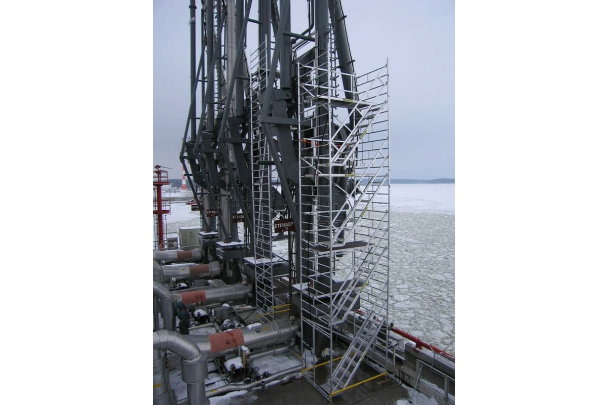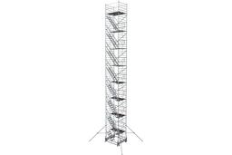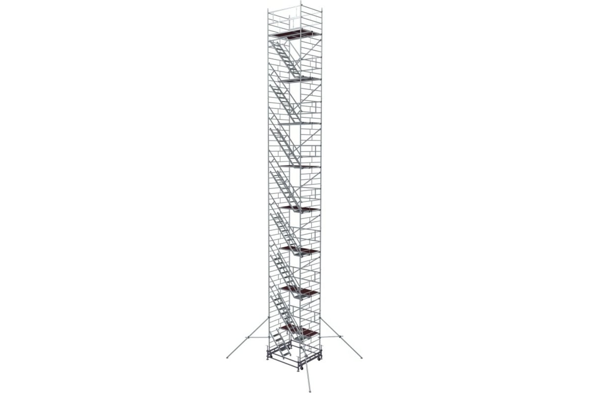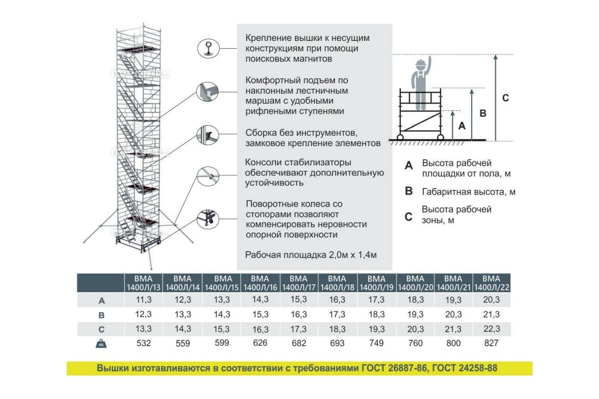 Вышка собирается из вертикальных рам. Рамы стыкуются между собой и фиксируются крепежными скобами. Вышка обеспечивает комфортный подъем с инструментом или иным грузом по наклонным лестничным маршам с удобными ступенями из рифленого профиля. Используются диагональные и горизонтальные связи (стяжки).