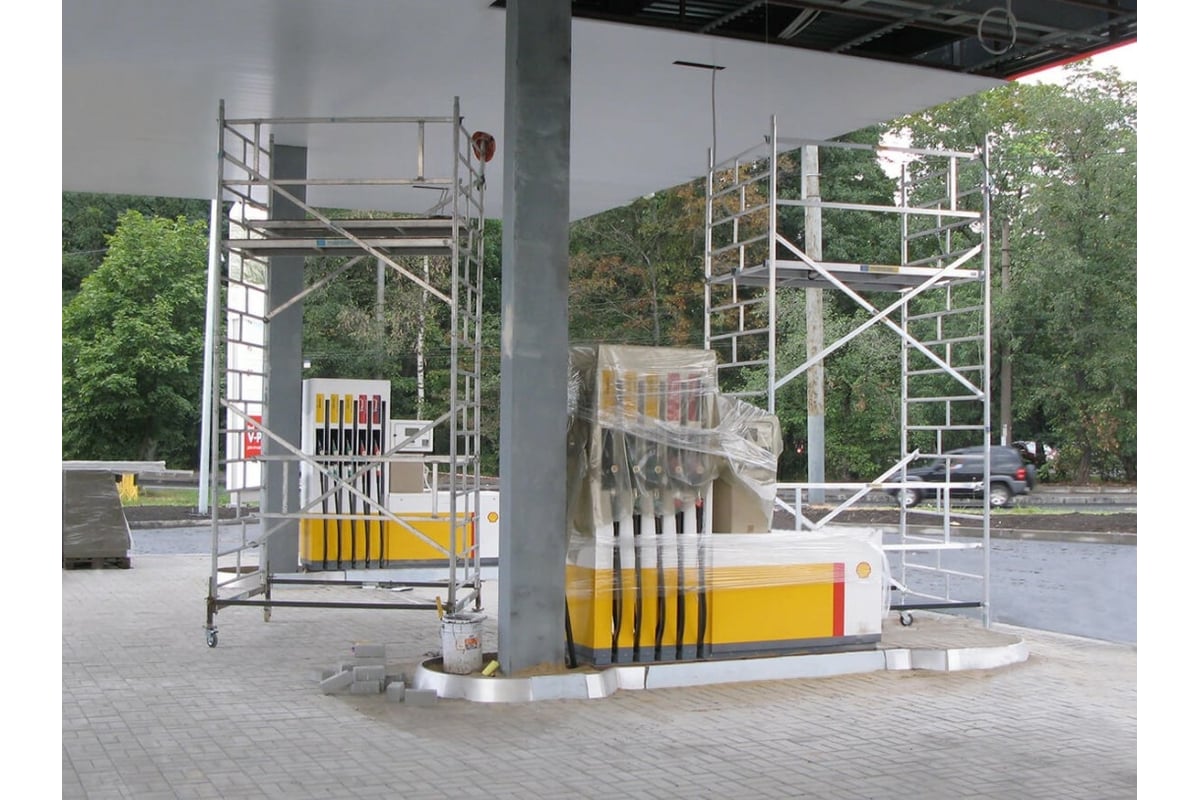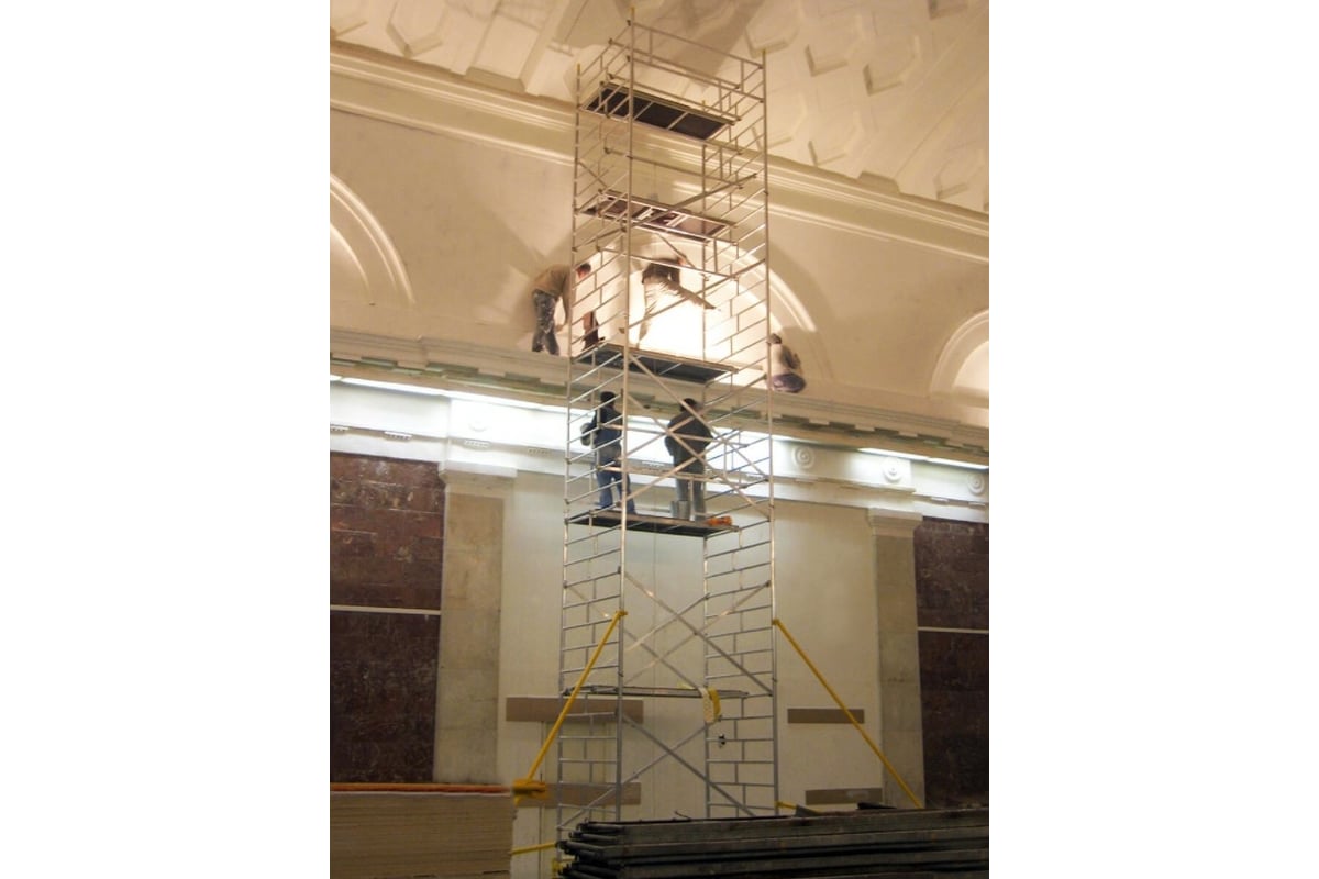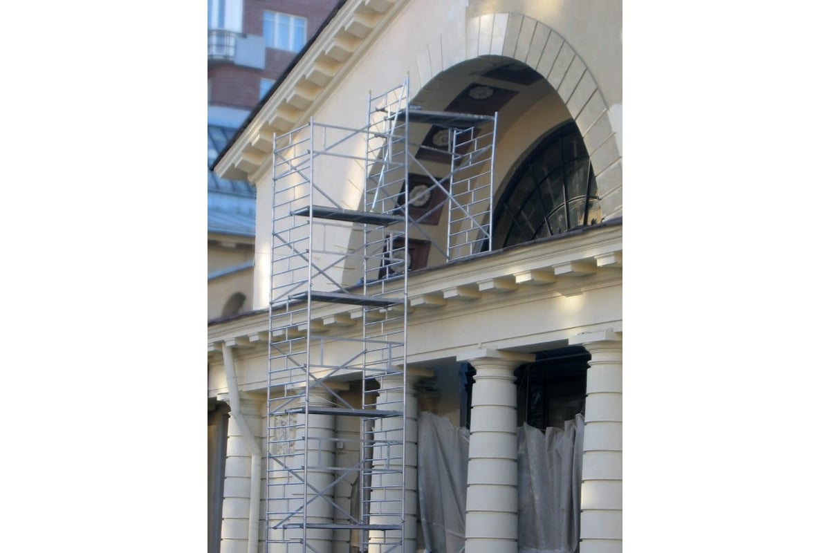 Вышки габаритной высотой 5 метров и более оснащены консолями-стабилизаторами (4 шт.). Монтируются на компактном основании из стальных стяжек. Все вышки оснащены поворотными колесами со стопорами. Колеса регулируются по высоте в рамках длины винтовой опоры.