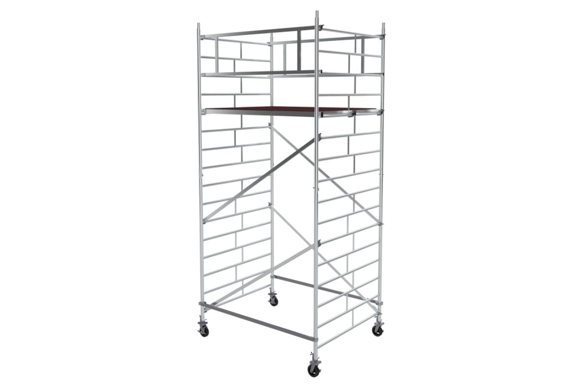 Модульная алюминиевая вышка MEGAL ВМА 1400/5 101405 обеспечивает подъем и организацию рабочего места на высоте с использованием лестничных маршей в строительно-монтажных, ремонтных и прочих работах.