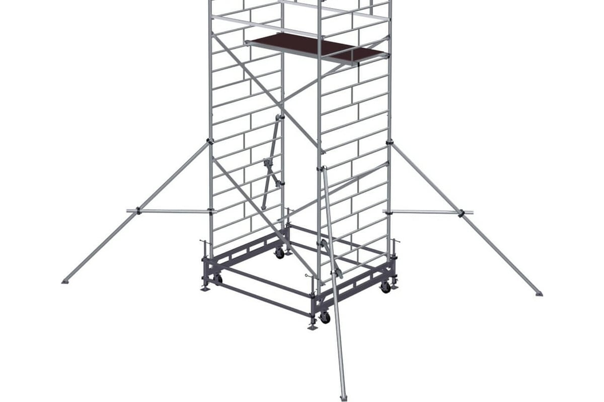 Вышки габаритной высотой 5 метров и более оснащены консолями-стабилизаторами (4 шт.). Монтируются на усиленном широком основании из двойной траверсы с колесами. Опорная поверхность на домкратах (исключая колеса).