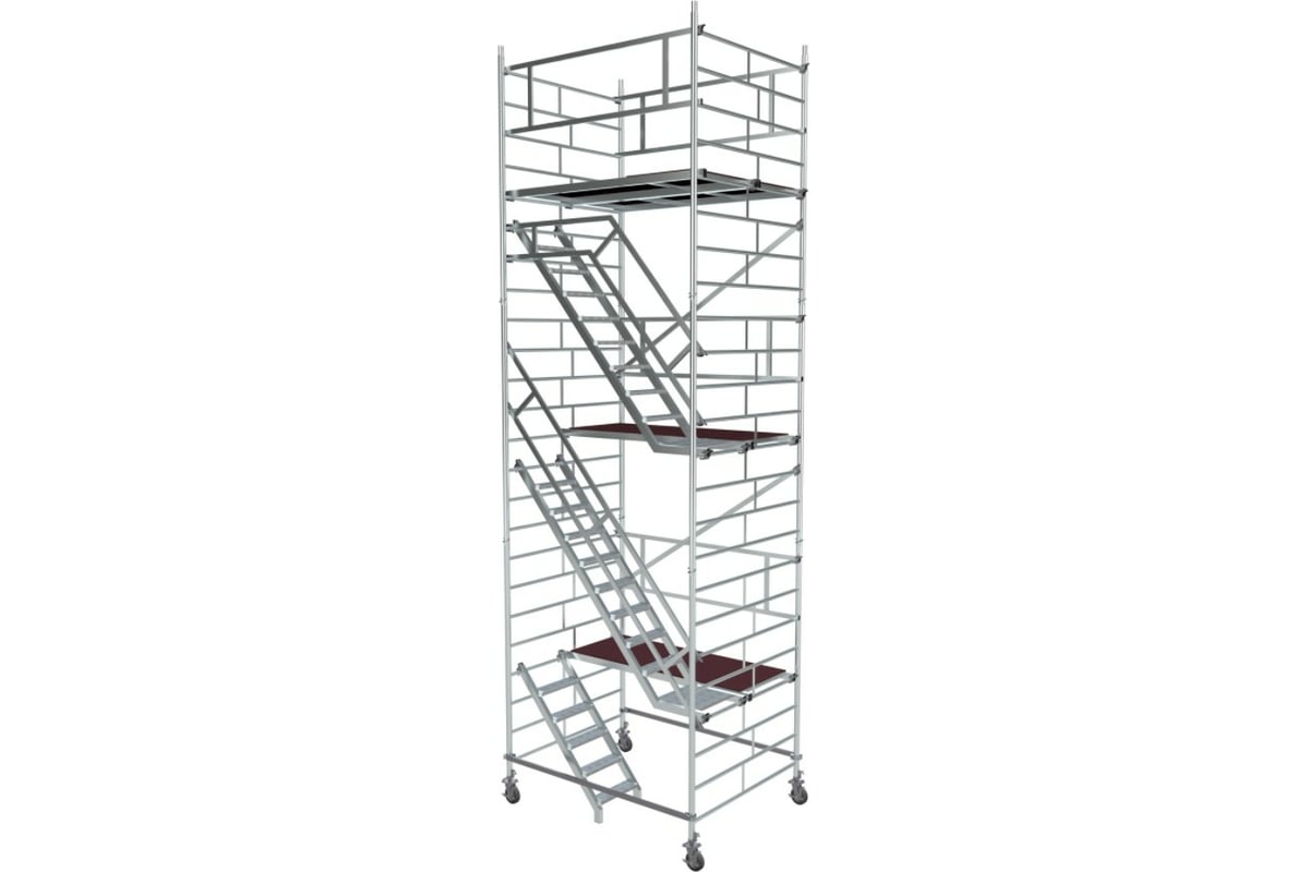 Модульная алюминиевая вышка MEGAL ВМА 1400Л/7 101457 обеспечивает подъем и организацию рабочего места на высоте с использованием лестничных маршей в строительно-монтажных, ремонтных и прочих работах.