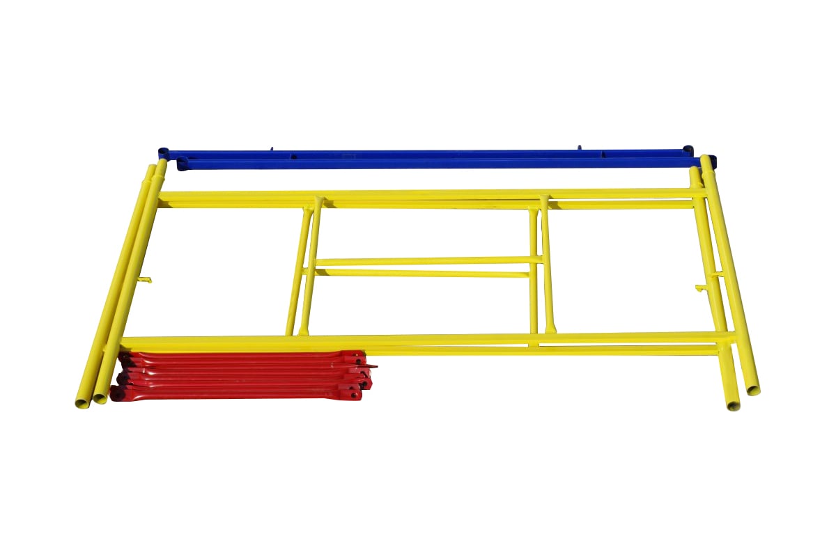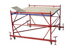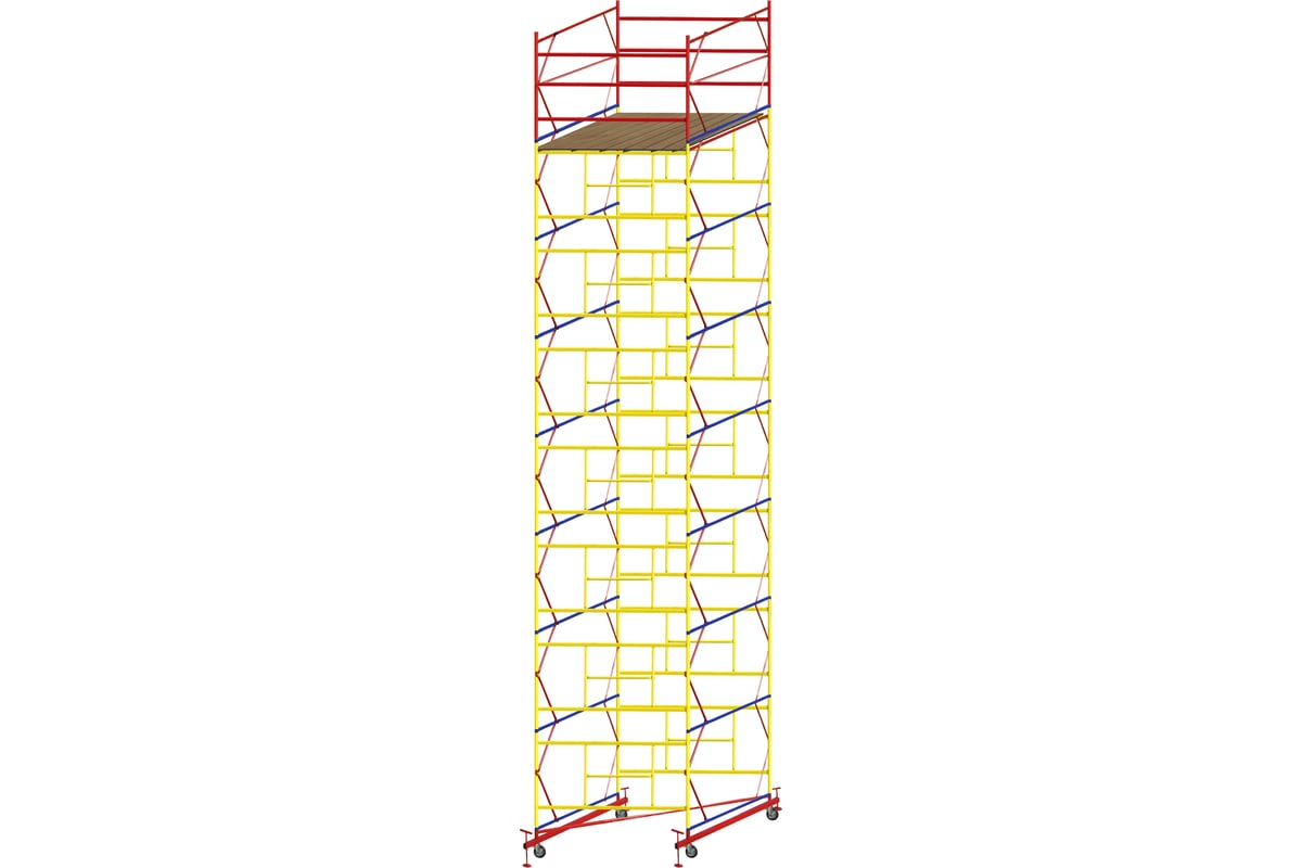 Вышка-тура легко собирается без использования специального инструмента благодаря флажковым механизмам соединения элементов. Благодаря наличию больших прорезиненных колес с фиксаторами положения, вышку можно легко перемещать по объекту.