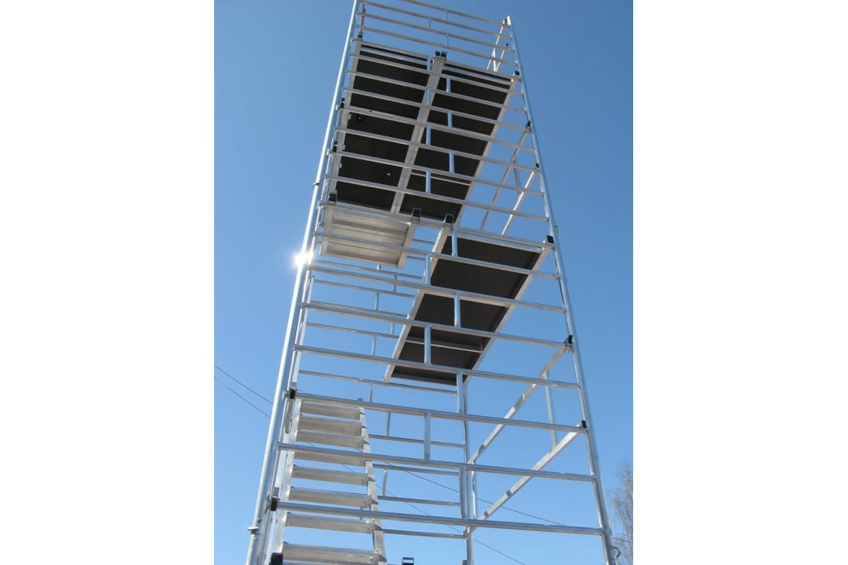 Монтируются на компактном основании из стальных стяжек. Все вышки оснащены поворотными колесами со стопорами. Вышки дополнительно регулируются по высоте в рамках длины винтовой опоры.