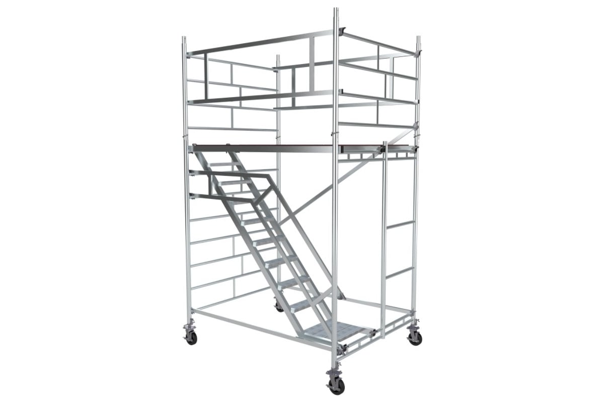 Модульная алюминиевая вышка MEGAL ВМА 1400Л/4 101454 обеспечивает подъем и организацию рабочего места на высоте с использованием лестничных маршей в строительно-монтажных, ремонтных и прочих работах.