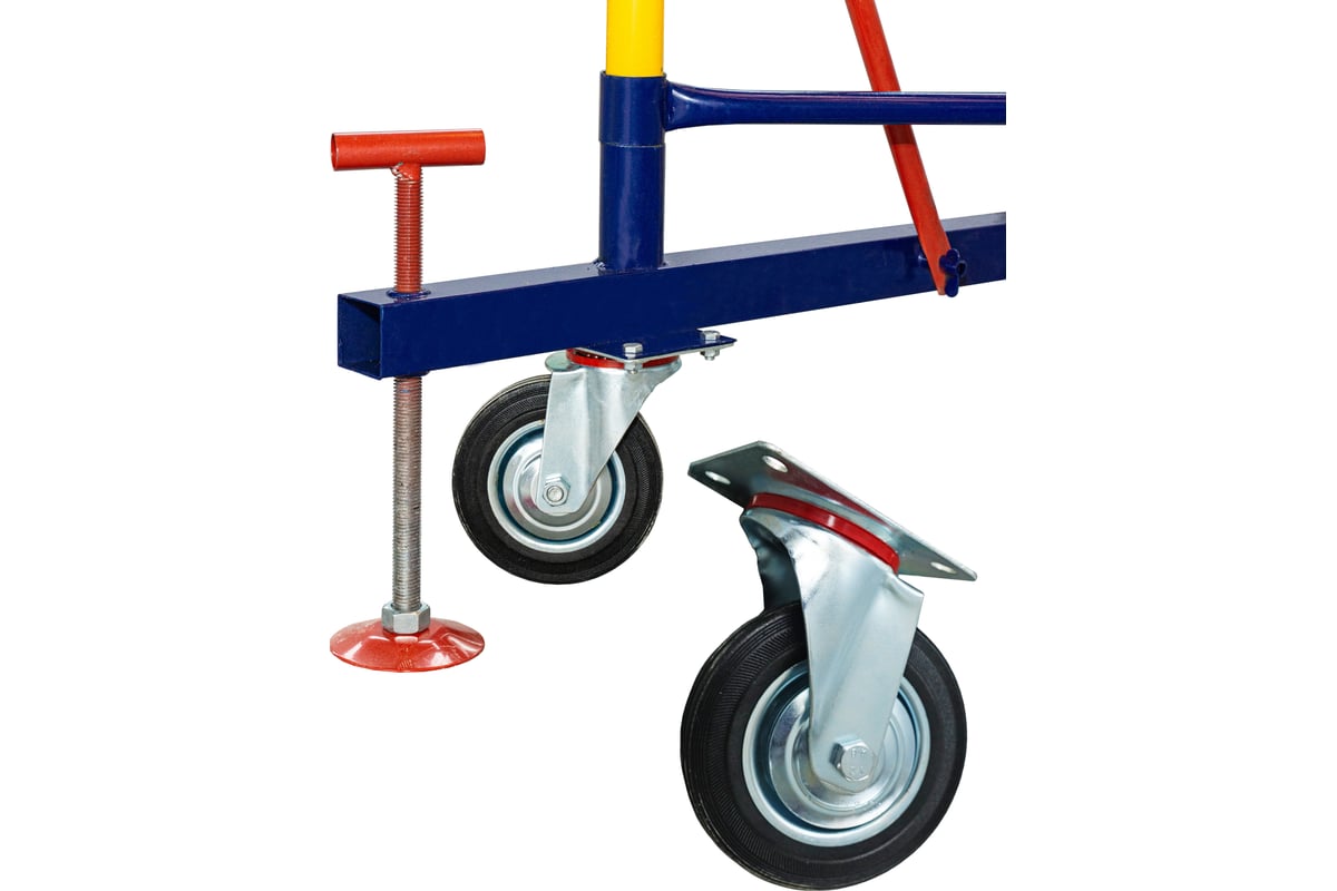 Вышка-тура легко собирается без использования специального инструмента, благодаря флажковым механизмам. Она также легко перемещается по объекту благодаря наличию больших прорезиненных колес с фиксаторами положения. Это позволяет тонко регулировать высоту вышки и фиксировать ее от нежелательных перемещений во время работы.