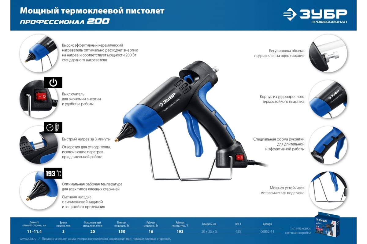 Термоклеевой электрический пистолет ЗУБР Профессионал 200, d 11 мм 06852-11 предназначен для склеивания различных материалов.