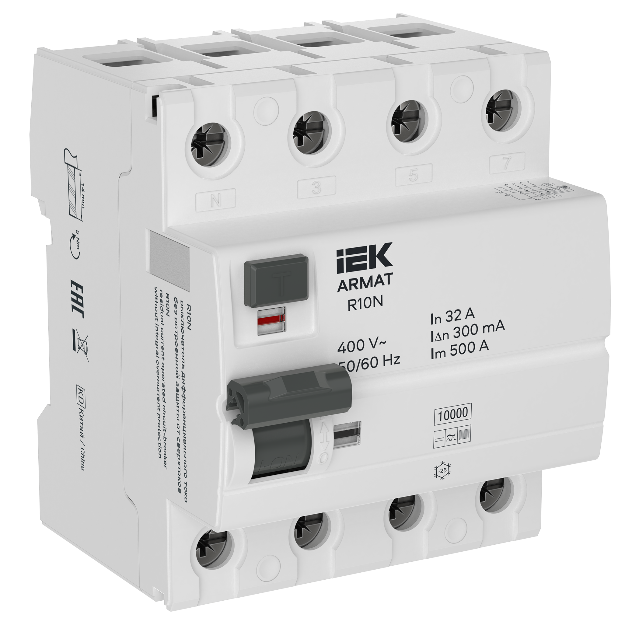 Выключатели дифференциального тока R10N типа B серии ARMAT предназначены для эксплуатации в однофазных или трёхфазных электрических сетях переменного тока напряжением до 400 В частотой 50/60 Гц. ВДТ типа В обеспечивают защиту от постоянной составляющей, переменной и пульсирующей составляющей и высокочастотной составляющей дифференциального тока.