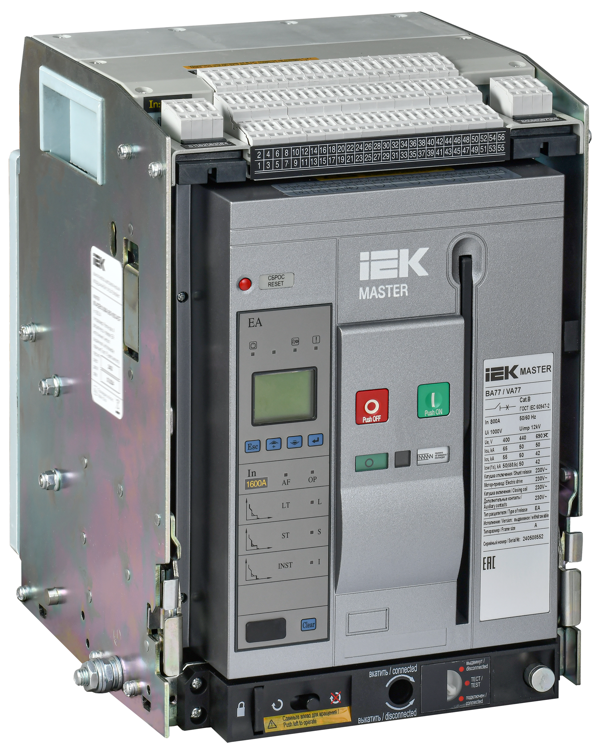 Воздушные автоматические выключатели серии MASTER IEK предназначены для защиты сетей низкого напряжения от коротких замыканий и перегрузок. Автоматические выключатели данной серии обладают оптимальным набором функций, для применения их на объектах жилищного, социального, коммерческого и дорожного строительства, а также энергетики и сельского хозяйства. Воздушные автоматические выключатели серии MASTER IEK поставляются укомплектованными набором аксессуаров для их полноценного применения в состав НКУ: мотор привод 230В, реле включения и отключения (с удержанием) 230В, контакт положения в корзине, набор из 4х перекидных контактов, аварийный контакт. В комплект автоматического выключателя также входит электронный контроллер и, в случае выдвижного исполнения база выдвижного исполнения.