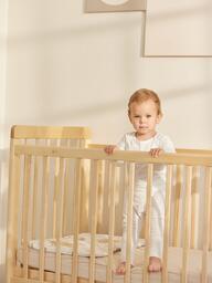 Комплект из кроватки с матрасом поможет быстро подготовить идеальное спальное место для новорожденного. Кровать изготовлена из 100% натурального материала – массива дерева. Рейки на стенках и дне обеспечивают естественную вентиляцию матраса и спального места. Оптимальная ширина между рейками позволяет ребенку всегда быть в поле зрения мамы, при этом его ручки и ножки не застрянут во время активного движения. У дна 3 положения по высоте: настраивайте, как вам удобно, в зависимости от возраста ребенка. Передняя стенка съемная, а длина спального места 120 см., благодаря чему кроватка подойдет для подросших детей до 3-4 лет. Она приятна на ощупь, а благодаря резинкам не скатывается и не съезжает.
