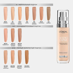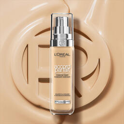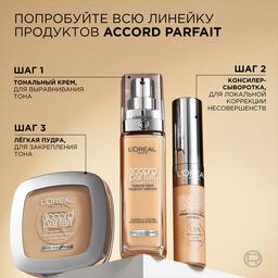 Жидкий тональный крем Accord Parfait от L'Oreal Paris выравнивает тон, подстраивается к цвету и текстуре кожи. Заметно преображает кожу за 2 недели применения: кожа более гладкая и сияющая. Ультра-тонкие пигменты подстраиваются под тон и подтон кожи. Формула на 80%, состоящая из увлажняющего крема с гиалуроновой кислотой. 24 часа увлажнения вашей кожи. Естественный финиш, сияющая кожа. SPF 16. КАК ПОДОБРАТЬ ТОН: номер обозначает интенсивность тона: от самого светлого 0.5 к темному 4. Буква обозначает подтон: N - для нейтрального подтона, R / C - для холодного розового подтона, D / W для теплого золотистого подтона. SPF 16