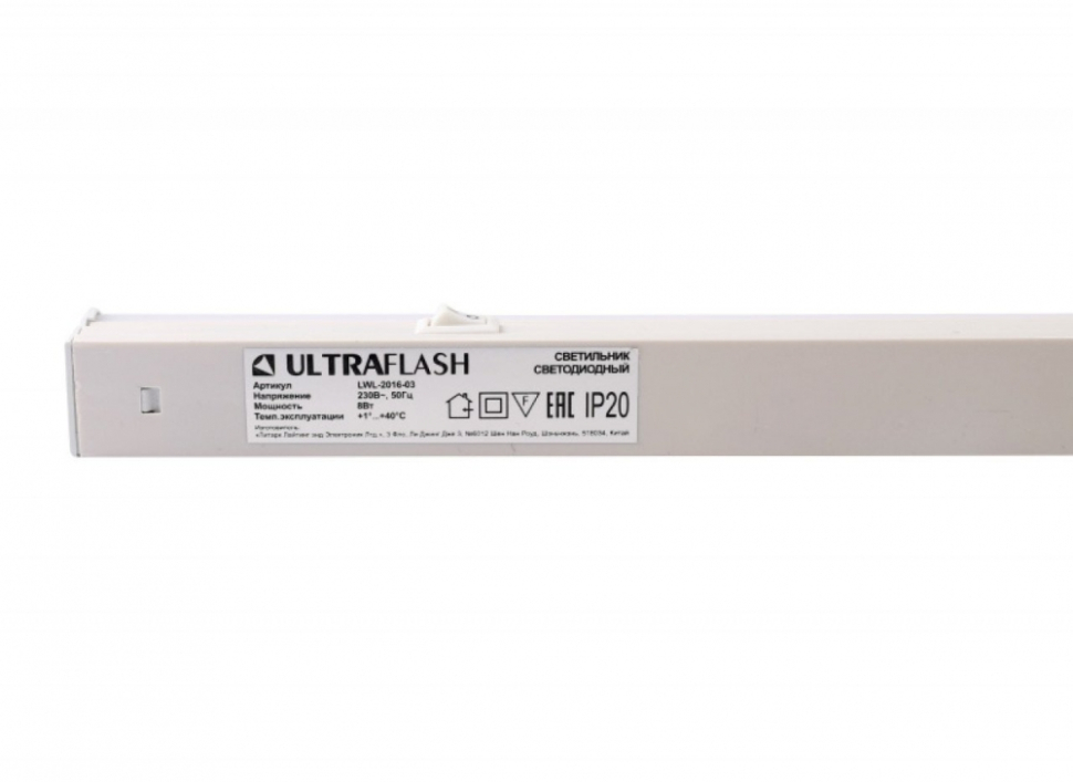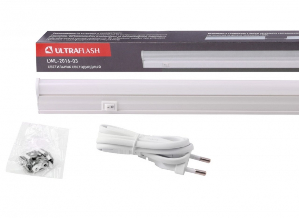 Светодиодный линейный светильник Ultraflash LWL-2016-03 (220В, с сетевым проводом, выключатель на корпусе), размер 580х35х22мм, источник света - встроенные светодиоды, мощность 8Вт, световой поток - 700лм, цветовая температура - 6000К, пластик. В комплекте соединитель и установочный комплект