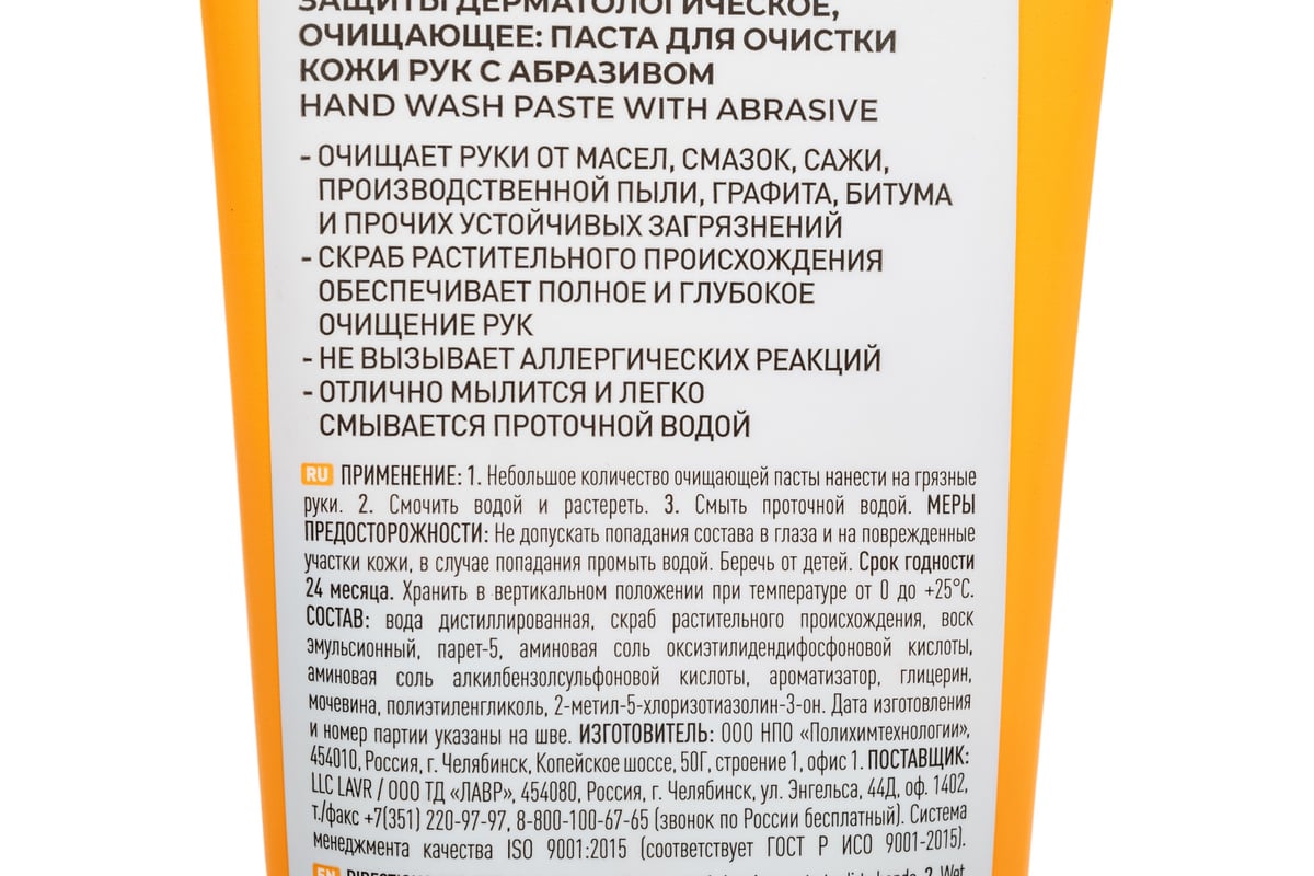 Паста для очистки рук является необходимым средством для обеспечения безопасности и гигиены в условиях производства и при обслуживании техники. Натуральный абразив в составе отшелушивают омертвевшие клетки кожи и эффективно удаляет грязь, масла, смазки и другие технические загрязнения с кожи.