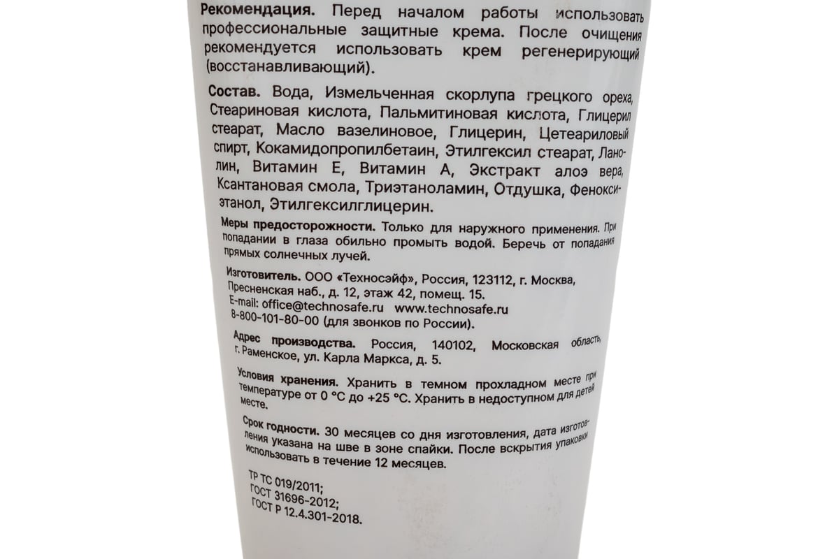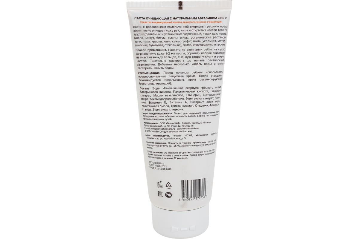Очищающая паста ТЕХНОСЭЙФ LINE 2 с натуральным абразивом, 200 мл 4660222170736 эффективно очищает кожу рук, лица и открытых частей тела от трудно удаляемых и устойчивых загрязнений, таких как: нефть, масла, мазут, битум, смолы, жиры, органические растворители, лаки, краски, смолы, клеи, сажа, графит, пыль (угольная, металлическая, бумажная, стекольная), земля, стекловолокно и прочие.