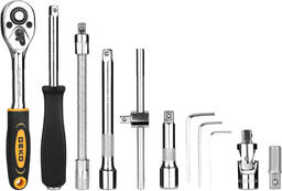 • Инструменты в наборе трещотка, отверточная рукоятка, ключ шестигранный (1.5, 2, 2.5 мм), шарнир
