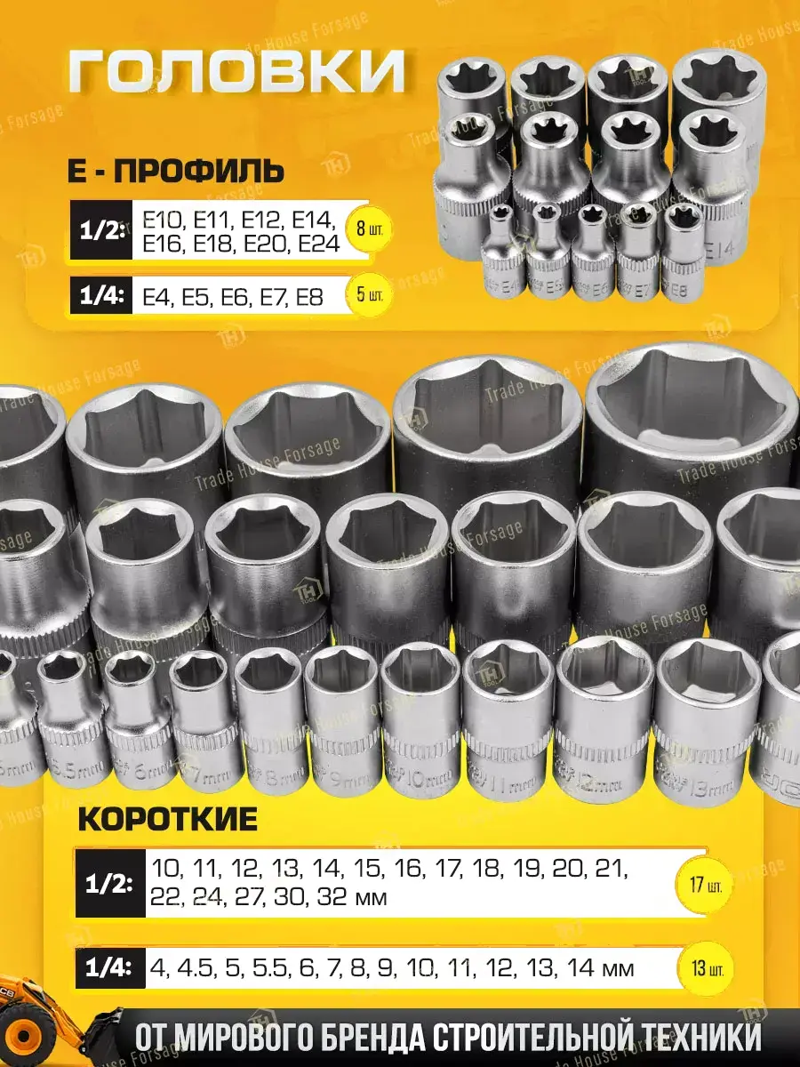 • Головки торцевые (30 шт.), глубокие торцевые (13 шт.), торцевые Е-тип (13 шт.), свечные (2 шт.), головки со вставкой (18 шт.)