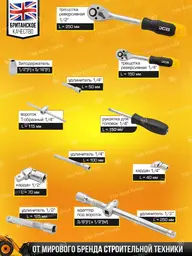 • Оснастка головки (76 шт.), насадки-биты (17 шт.), удлинители (4 шт.), кардан (2 шт.), переходник (1 шт.)