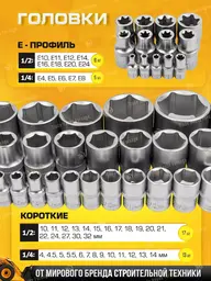 • Торцевые головки 1/2" (10-21, 22, 24, 27, 30, 32 мм), 1/4" (4, 4.5, 5, 5.5, 6, 7, 8, 9, 10, 11, 12, 13, 14 мм)