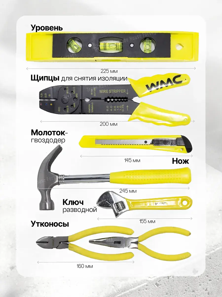 • Инструменты в наборе отвертка, кусачки, молоток, нож, утконосы, щипцы