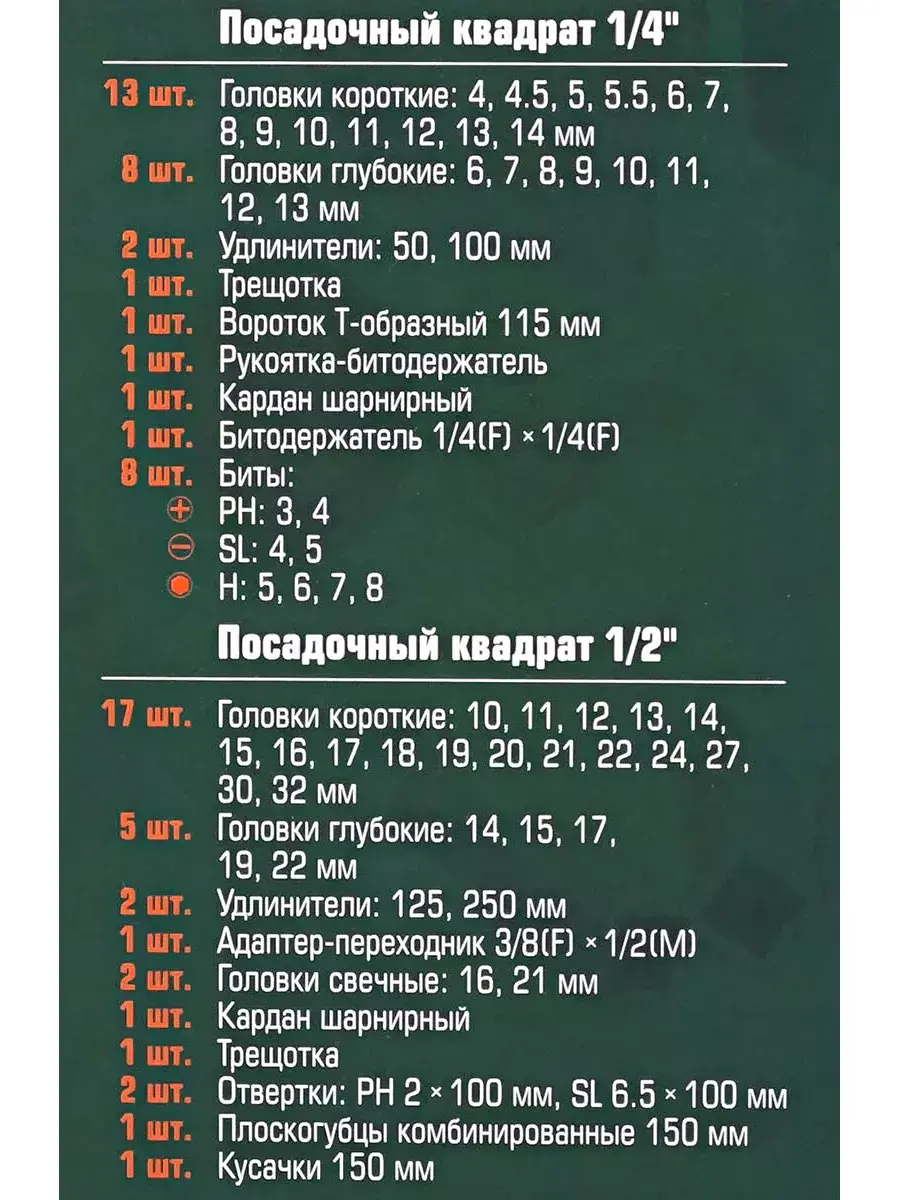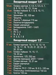 • Головки торцевые (30 шт.), глубокие торцевые (13 шт.), свечные (2 шт.)